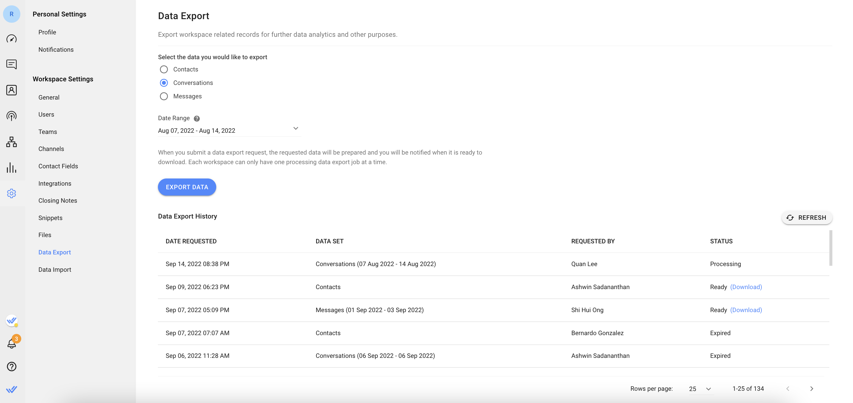 Go to Settings module > select Data Export under Workspace Settings > select the data to export from the drop-down list > set the date range from the drop-down list (only available for Conversations, Messages, and Failed Messages data) > click Export Data to begin the process. Once it’s ready, download the file from the Data Export History table anytime within 7 days.