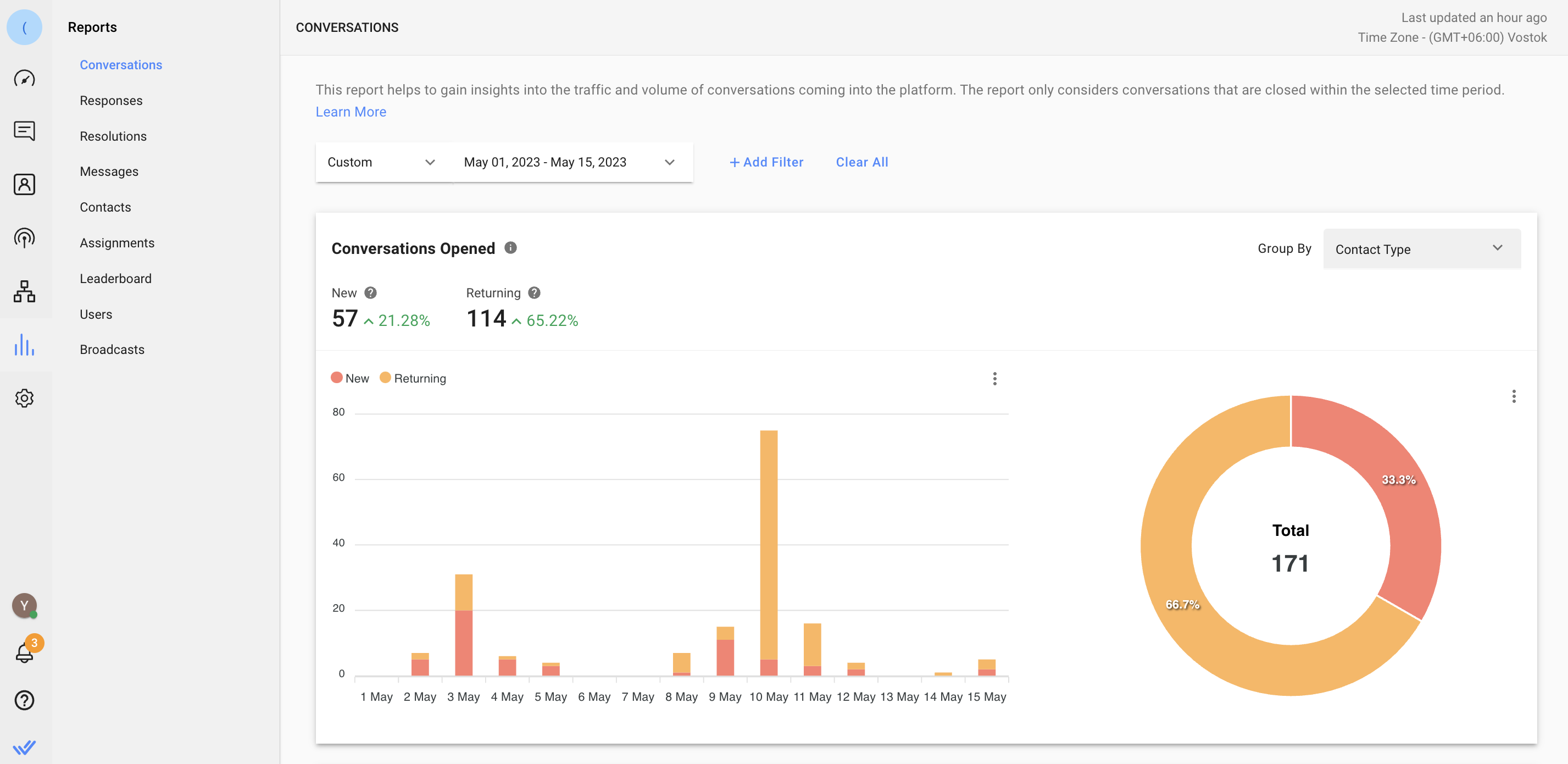 Use the Conversations Opened by Contact Type to identify if the conversations were opened by new or returning Contacts. If the opened conversations are mostly from new Contacts, this could mean your business is getting inquiries from new customers. If the opened conversations are mostly from returning Contacts, this could mean they are returning customers messaging your business to complain about a service or product.