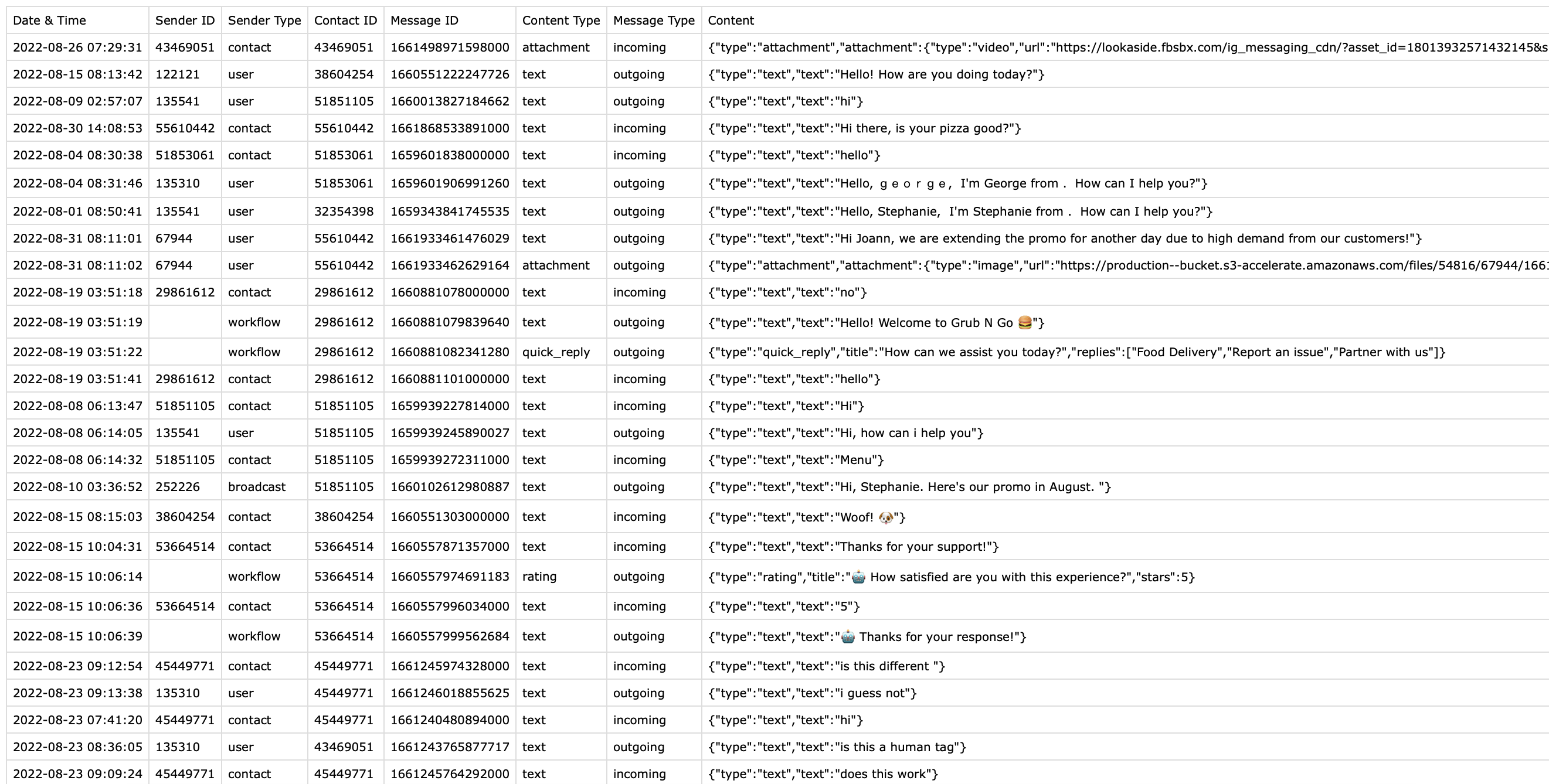 By downloading Messages data, you’ll get records of all messages sent in the Workspace within the selected date range. Messages data includes Date & Time, Sender ID, Sender Type, Contact ID, Message ID, Contact Type, Message Type and Content of the message.