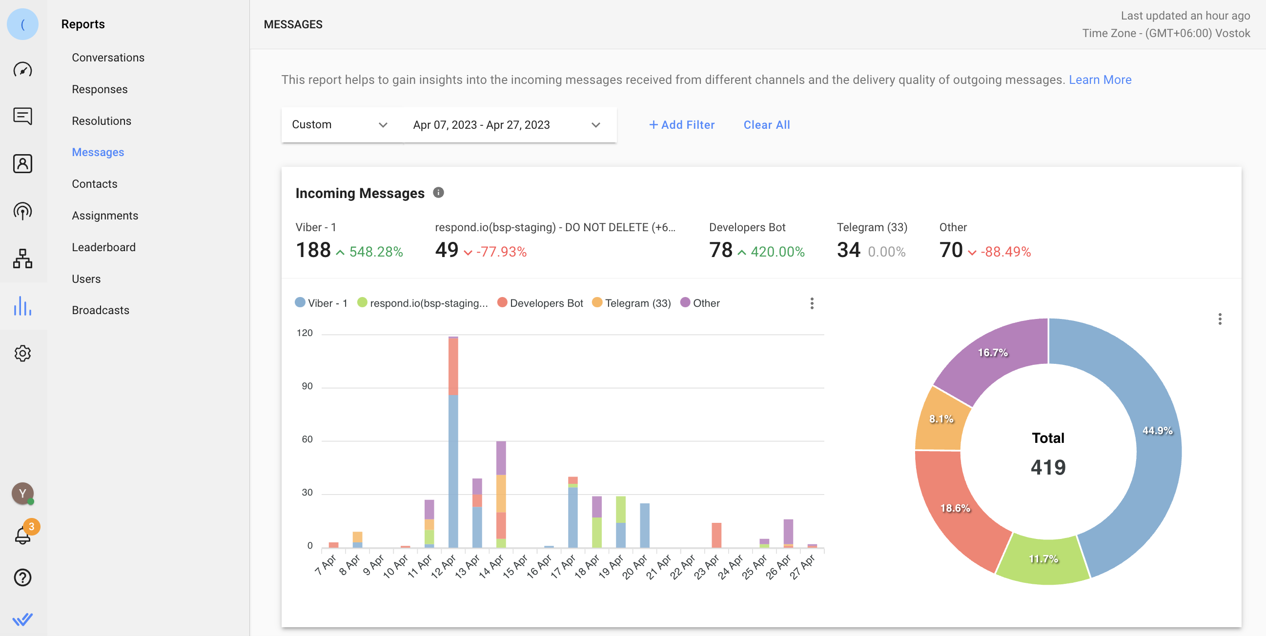 Use the Incoming Messages chart to identify the Channel customers used the most when sending messages to your business. Understanding the Channel's popularity among your customers helps to justify a subscription cost for a particular Channel if necessary. For example, if most of your customers are using WhatsApp to message you, then it’s justifiable to keep paying for your official WhatsApp API account.