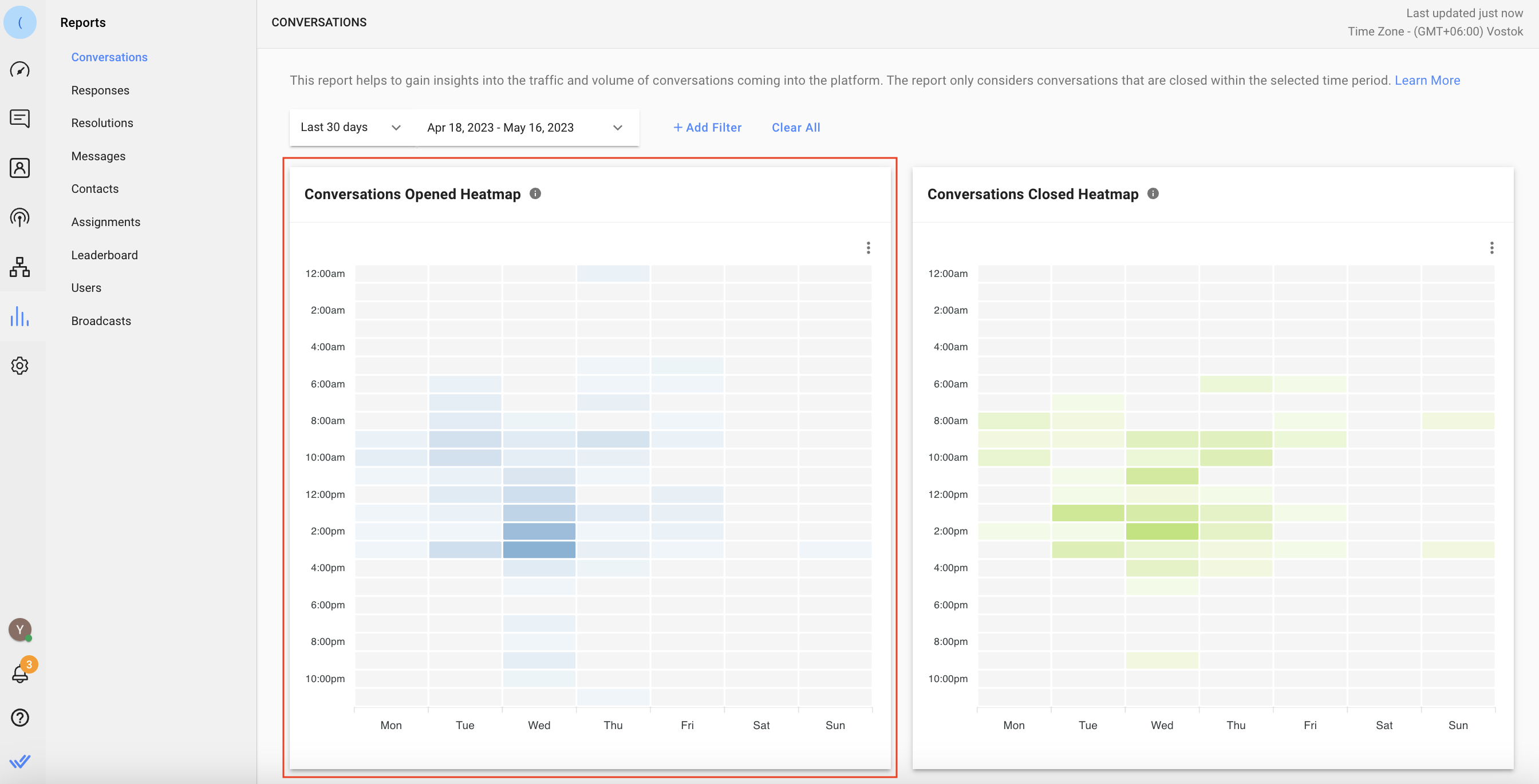 Go to Reports module > Conversations > Conversations Opened Heatmap.