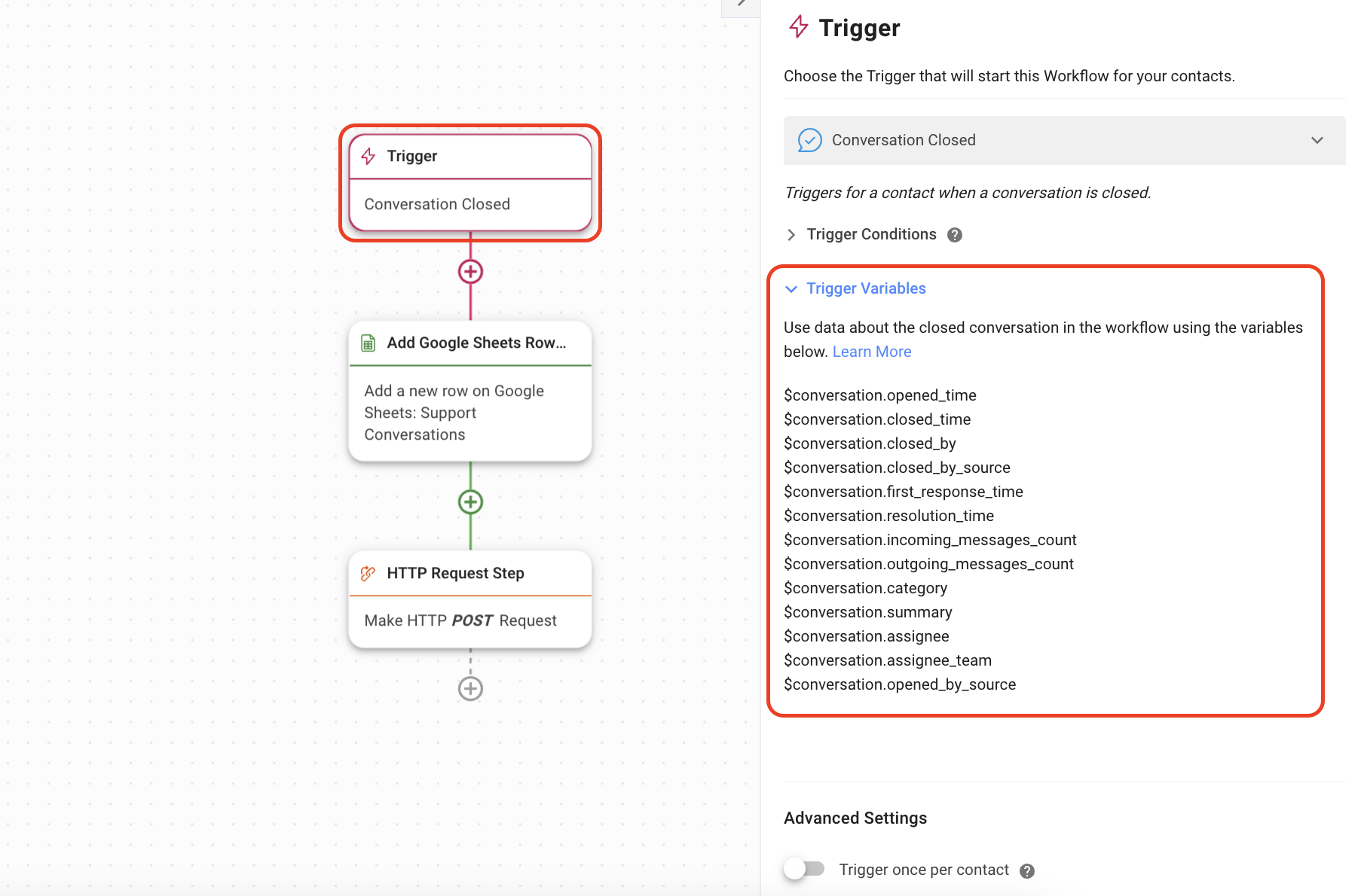 Apply the relevant Trigger Variables in the configuration of the Add Google Sheets Row Step or HTTP Request Step to automatically send selected closed conversation data to a Google Sheet or a data warehouse.