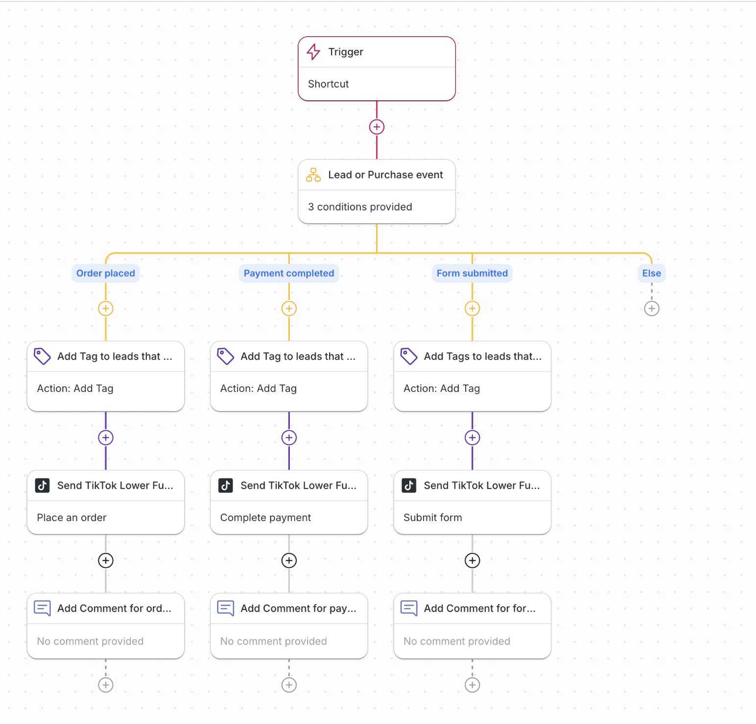 This Workflow Template allows you to qualify leads and track conversions efficiently. By using this workflow, agents can click on a Shortcut to tag contacts based on their actions—whether they placed an order, completed a payment, or submitted a form. Simultaneously, the workflow sends Lower Funnel Events back to TikTok, improving ad targeting and optimizing campaign performance with valuable conversion insights.