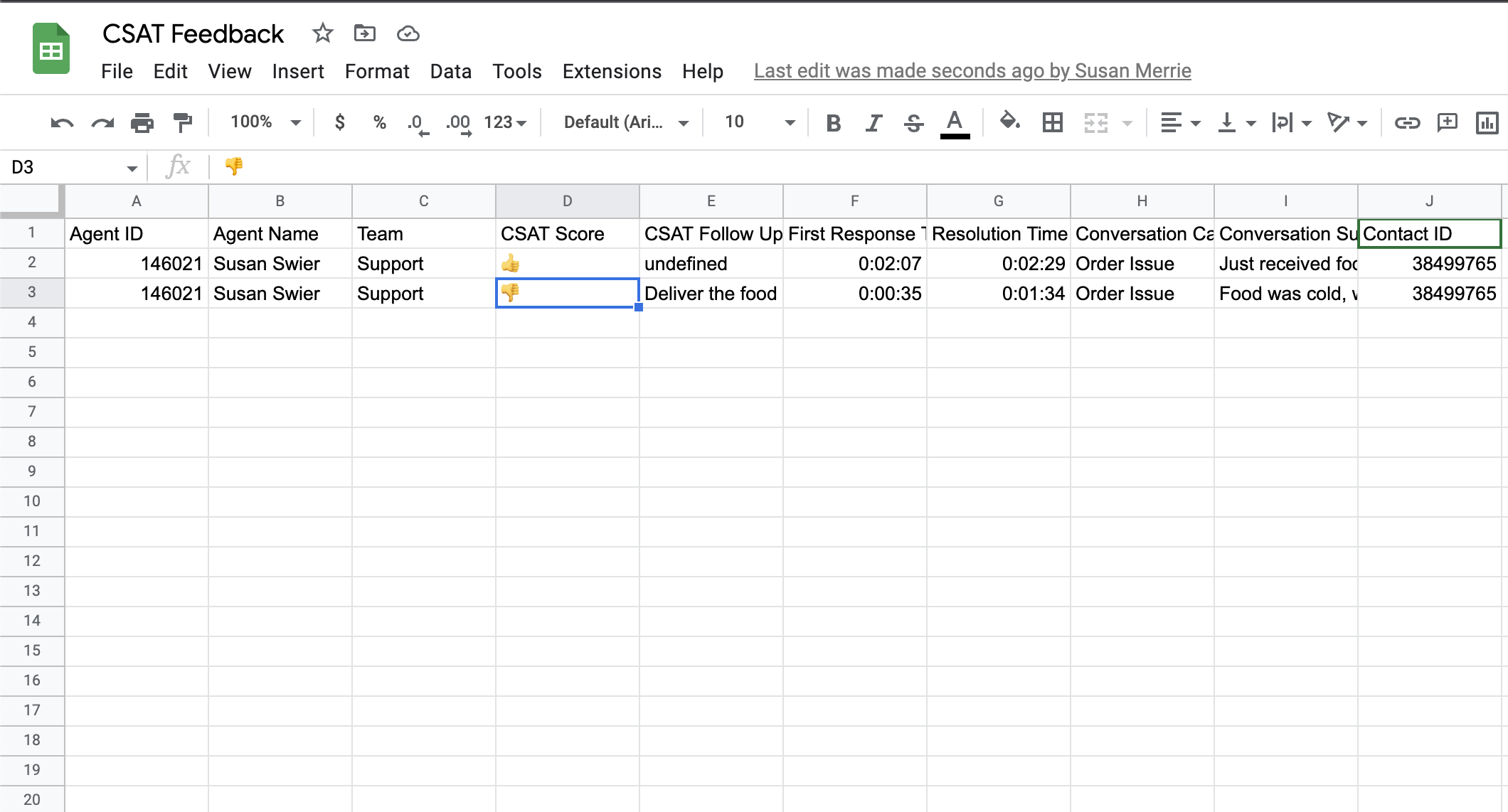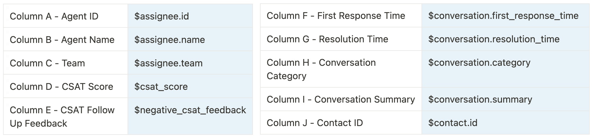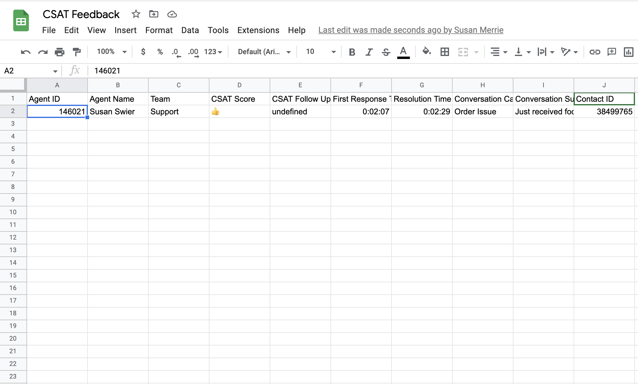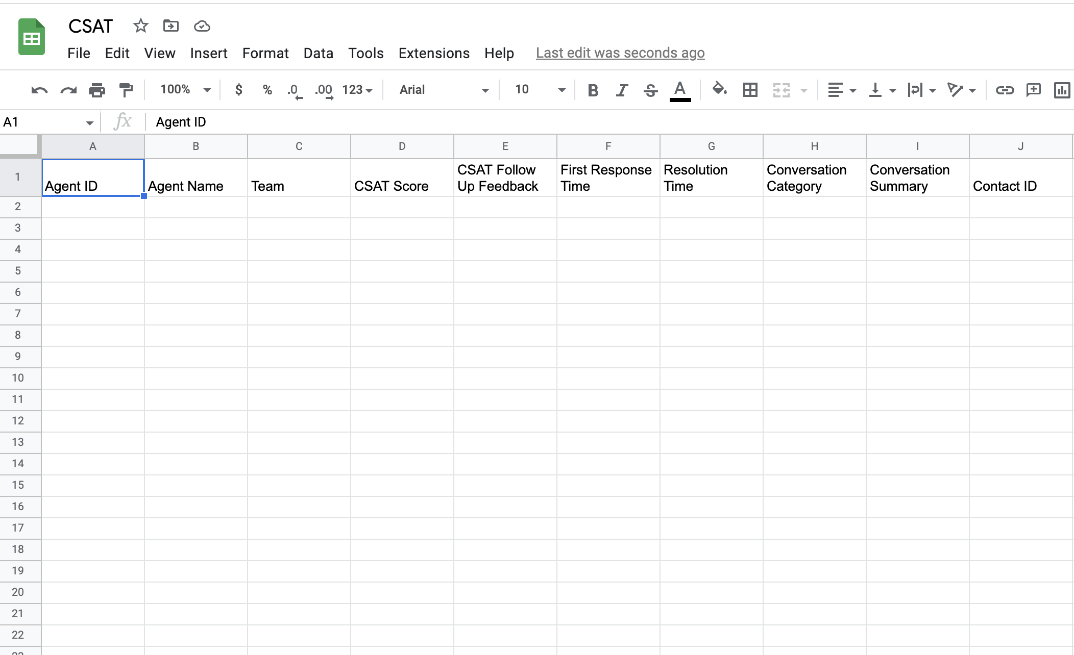 Create a Google Sheet with the following headings: Agent ID, Agent Name, Team, CSAT Score, CSAT Follow Up Feedback, First Response Time, Resolution Time, Conversation Category, Conversation Summary, Contact ID.You may edit the headings as desired to meet your business needs, but note that if you change them, you will also need to edit the column mapping in the Save to Google Sheet step in the Workflow.