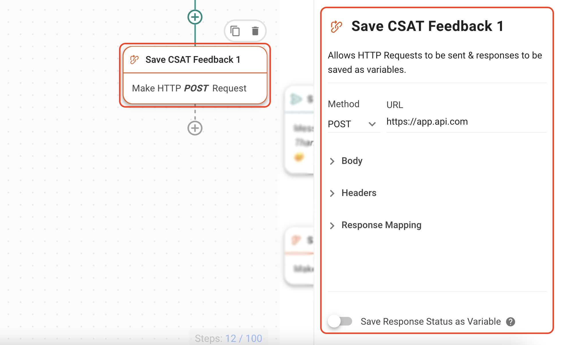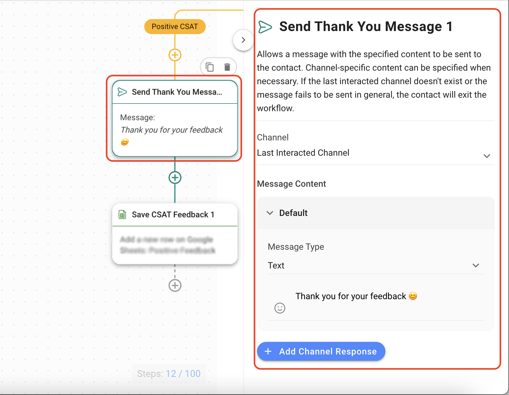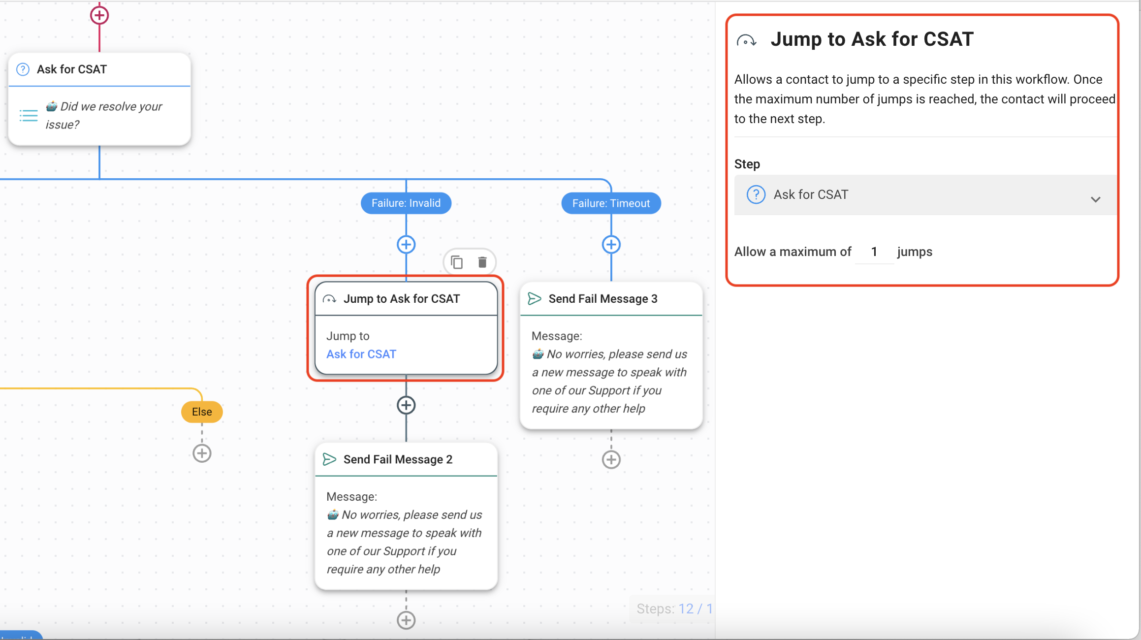 The Workflow is set up with a Jump Step if the response is invalid. This will jump back to Ask for CSAT step. The default configuration is one jump, but you can edit the number of jumps allowed.