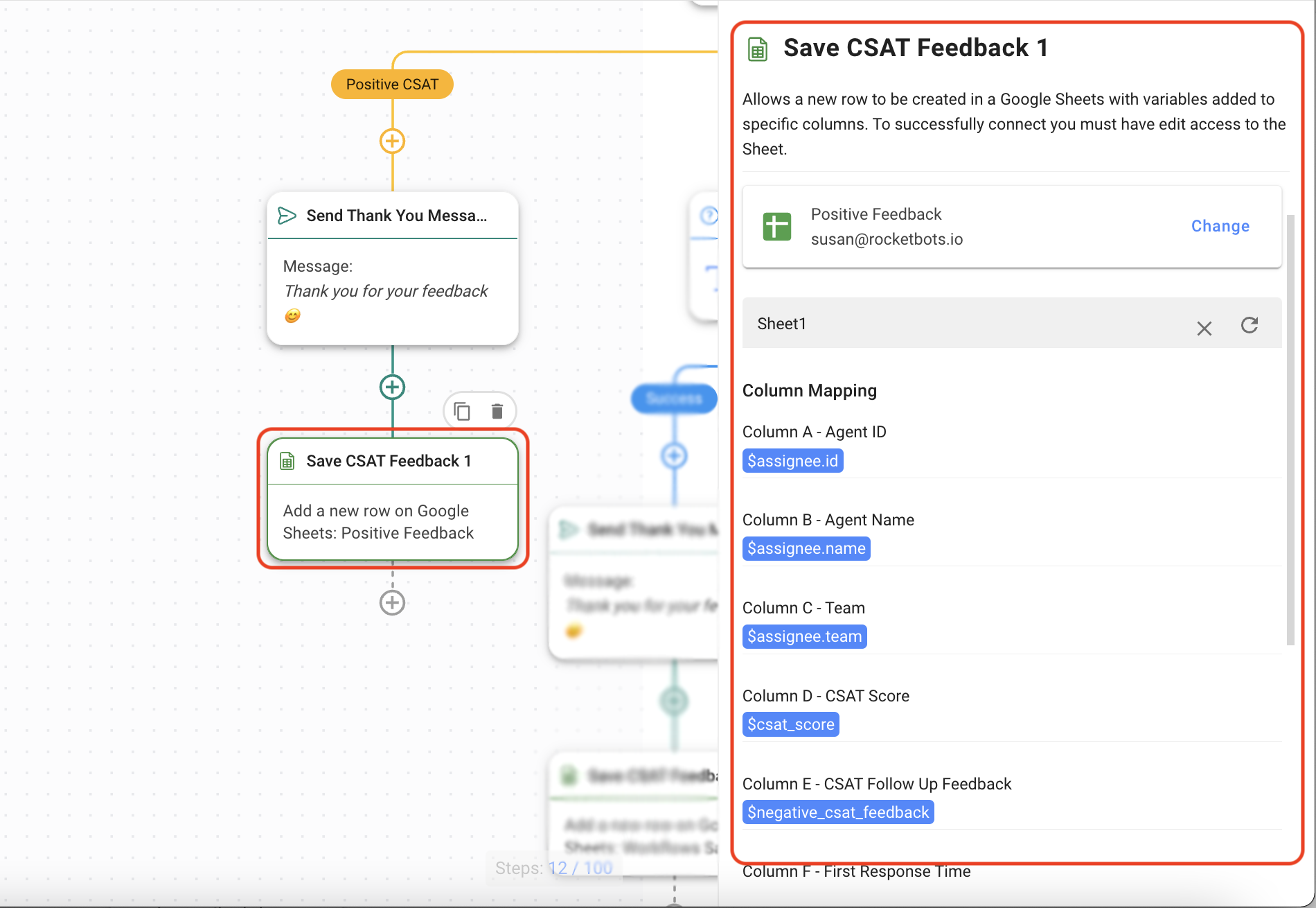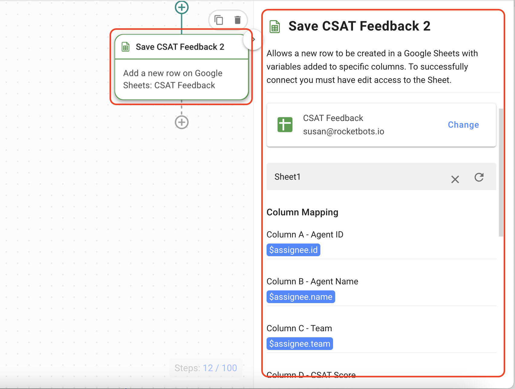Configure the data to send to a Google Sheet.Select the Google Sheet you’ve prepared earlier for saving CSAT data > Add relevant Variables to the Column Mapping fields.