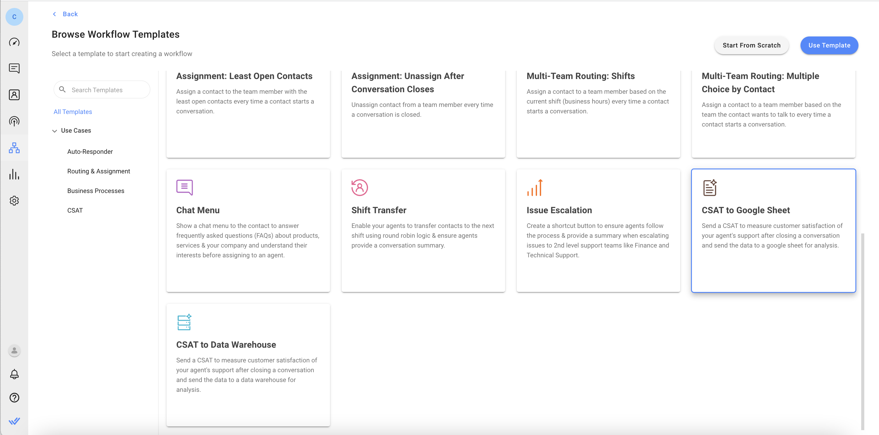 On the respond.io platform menu, click Workflows > + Add Workflow. Then, click CSAT to Google SheetUse Template