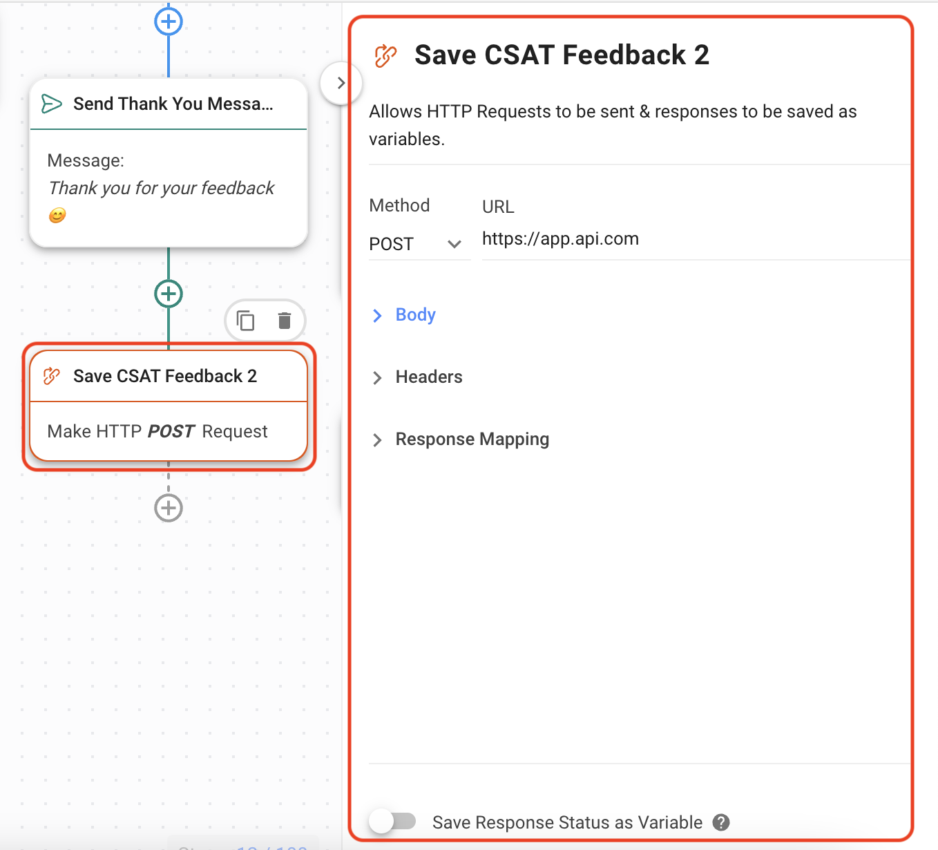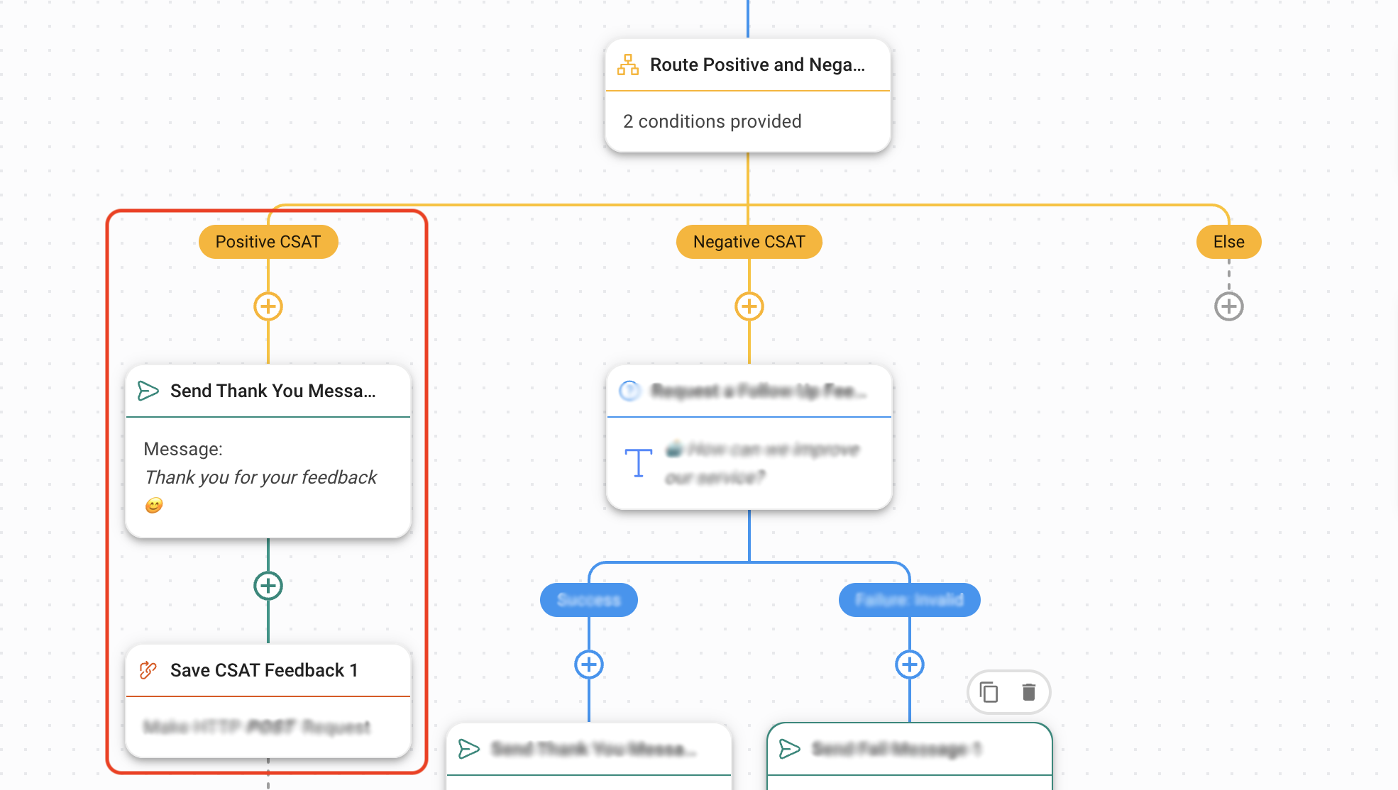 When the customer selects 👍, they will be routed to this branch where they’ll receive a message and their responses will be saved.