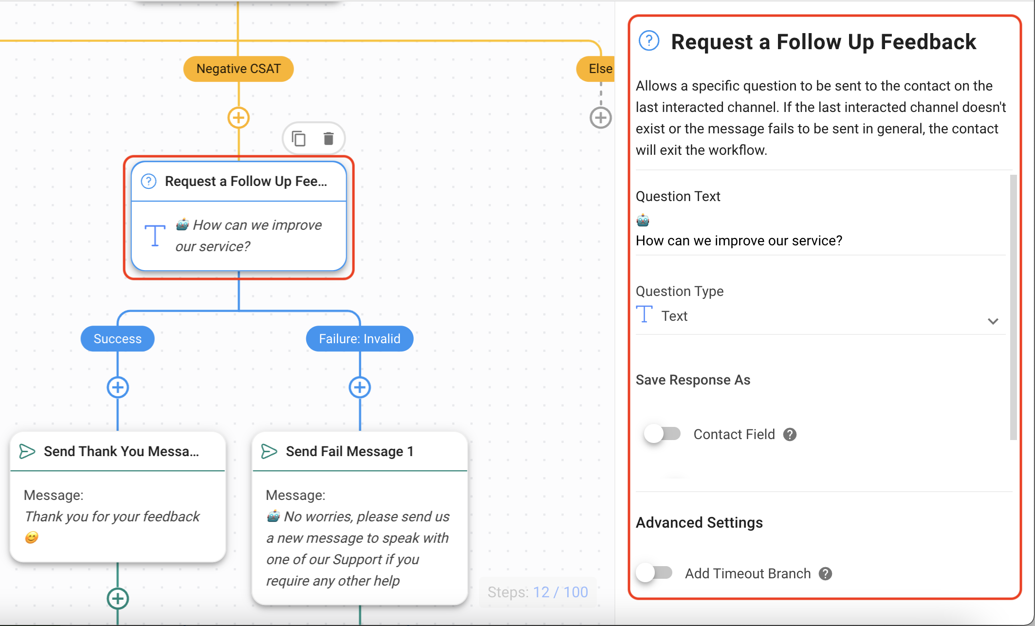 If no feedback is given, the Fail Message will be sent, and all the data except CSAT Follow Up Feedback will be saved. Configure Save CSAT Feedback 3 step exactly as done for the first two CSAT Feedback steps.