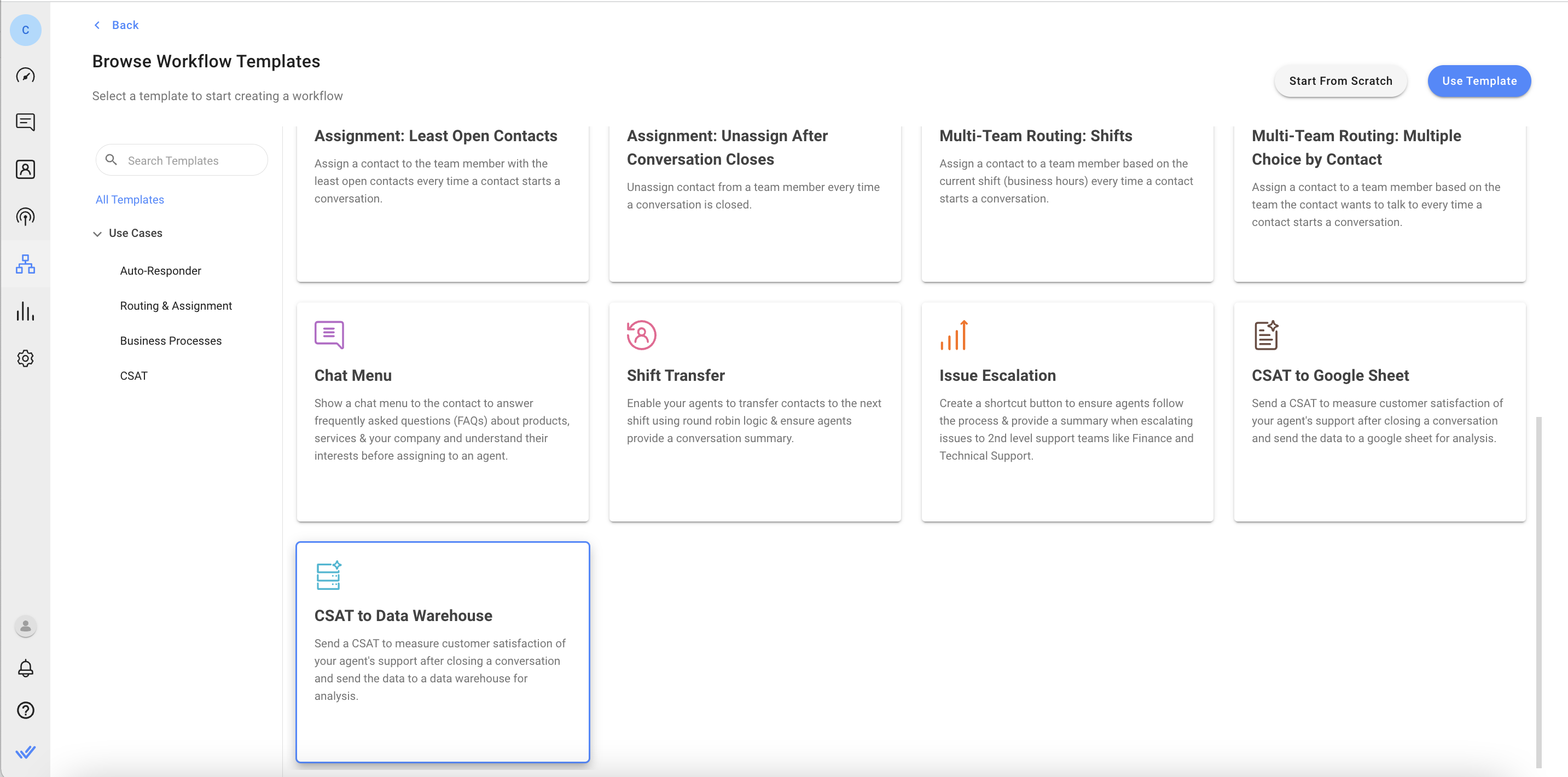 On the respond.io platform menu, click Workflows > + Add Workflow. Then, click CSAT to Data WarehouseUse Template