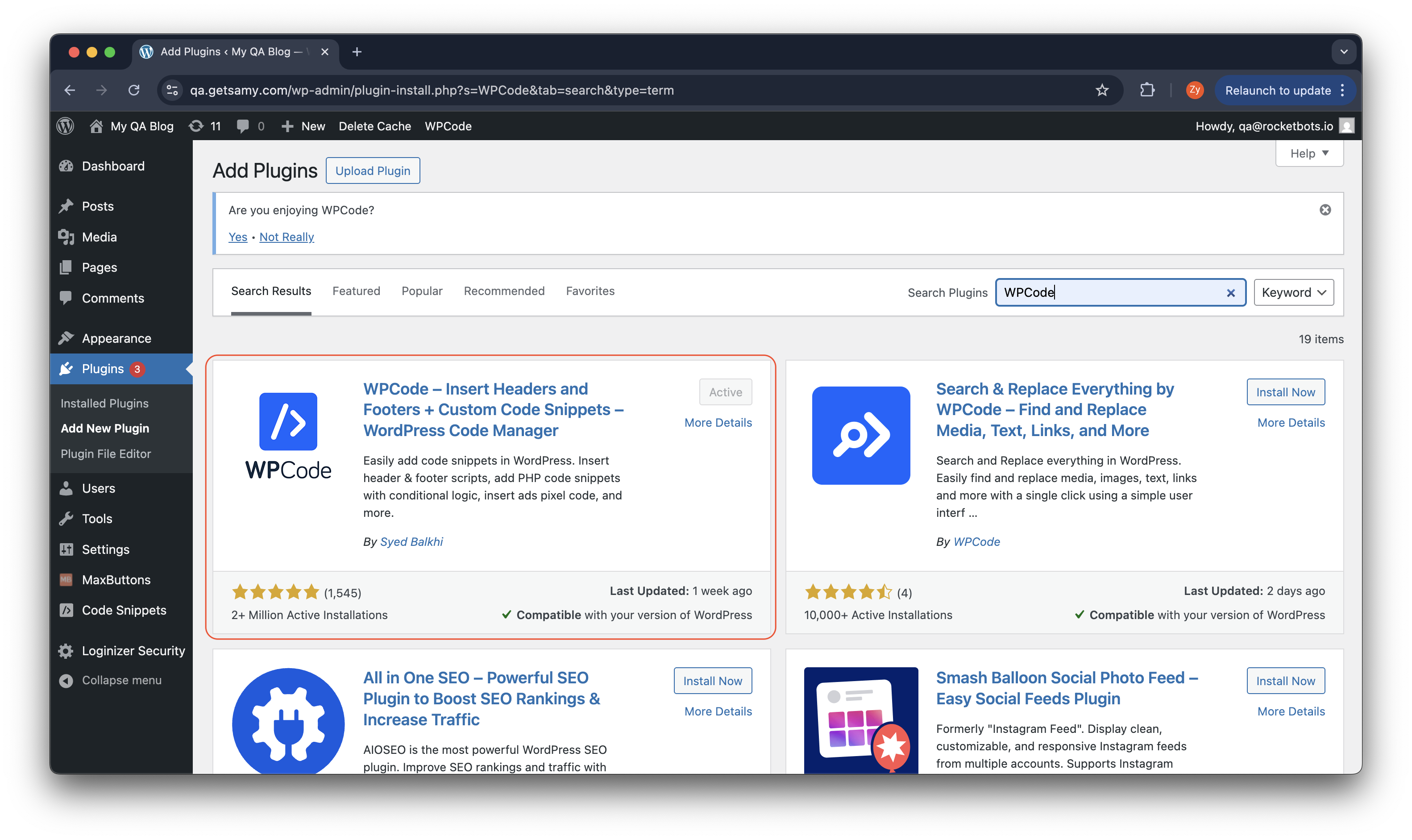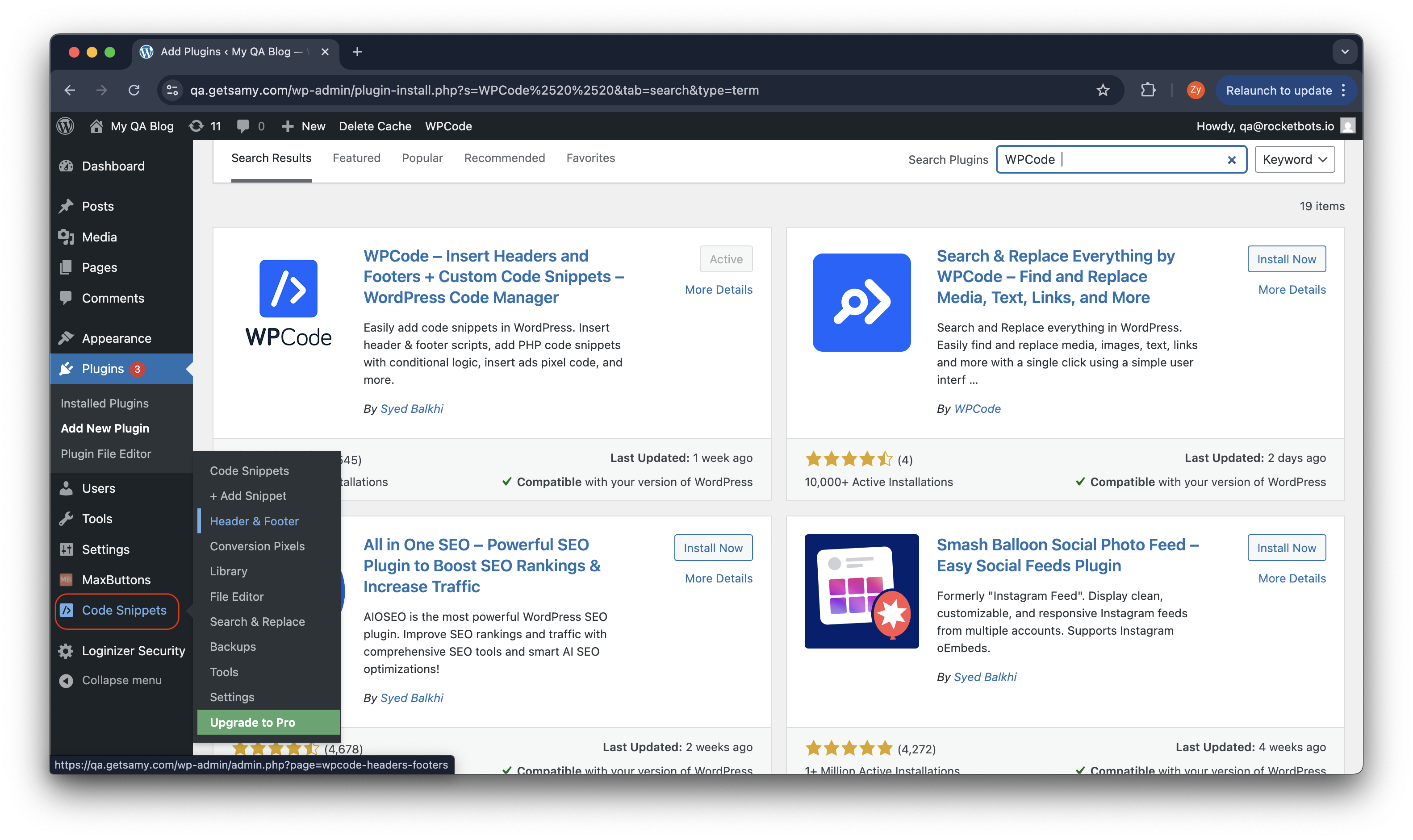 Using the search bar, search for the WPCode plugin. You will see many options on the search result page that you can use, but we will be using the "Insert Header and Footers" plugin by WPCode for this tutorial. Press the Install Now button and make sure you activate the plugin to make use of it.