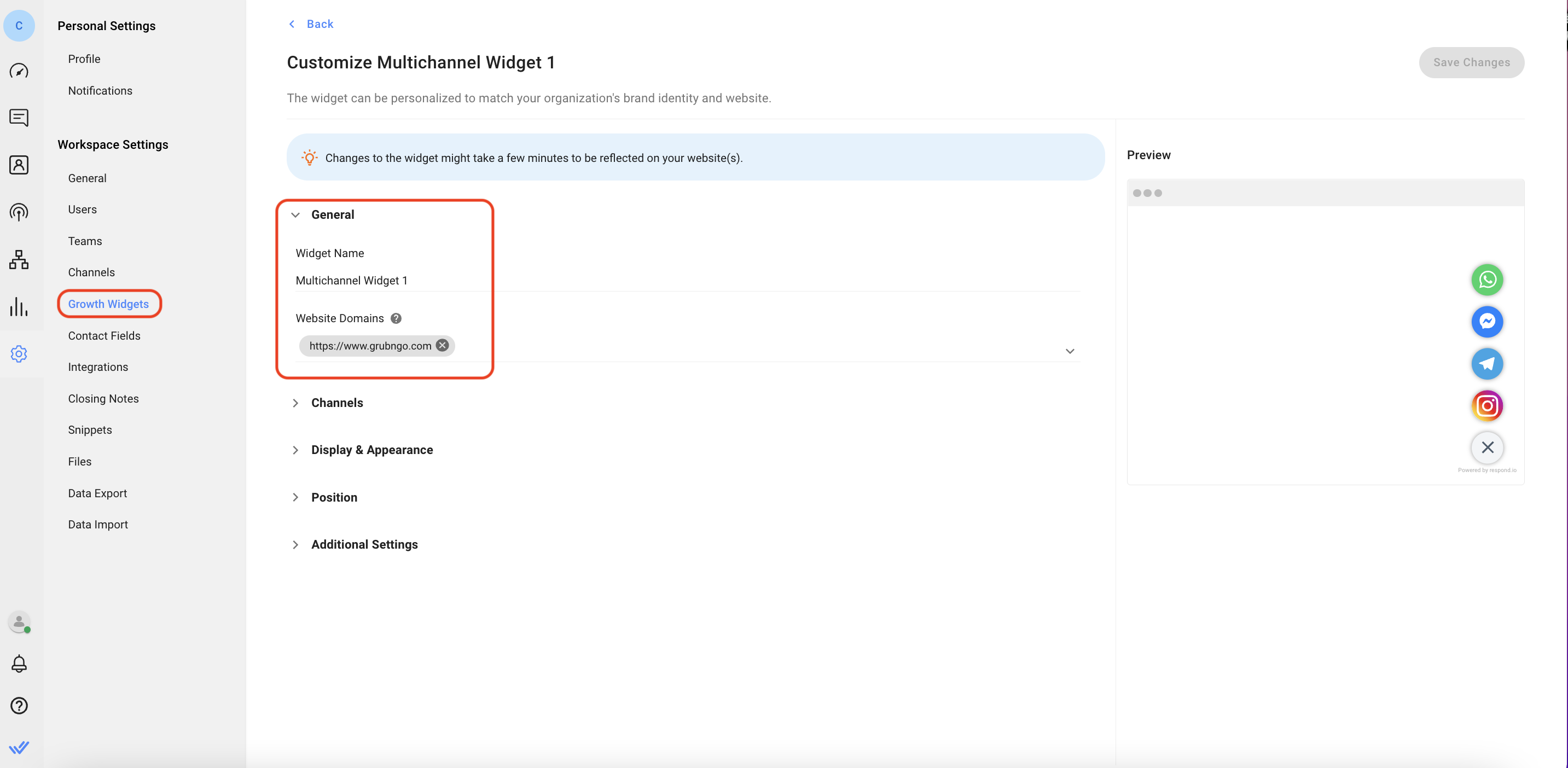 Go to respond.io settings > select Growth Widgets > click on the widget you want to add to your website > in the General toggle, add your website domain to the Website Domains field.