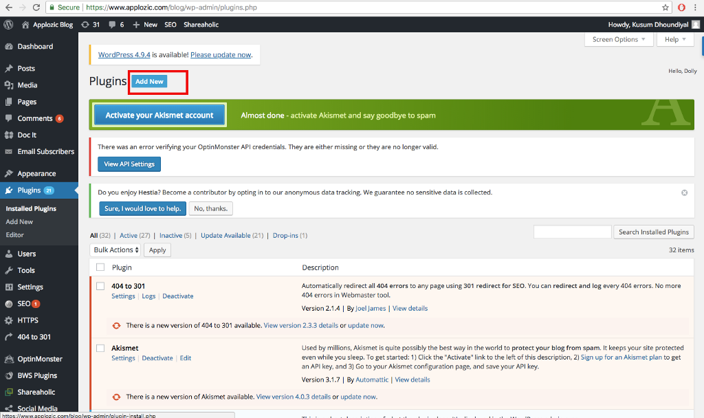 From the left navigation panel, click on Plugins. On the Plugins Page, press the blue Add New button on the top of the page.