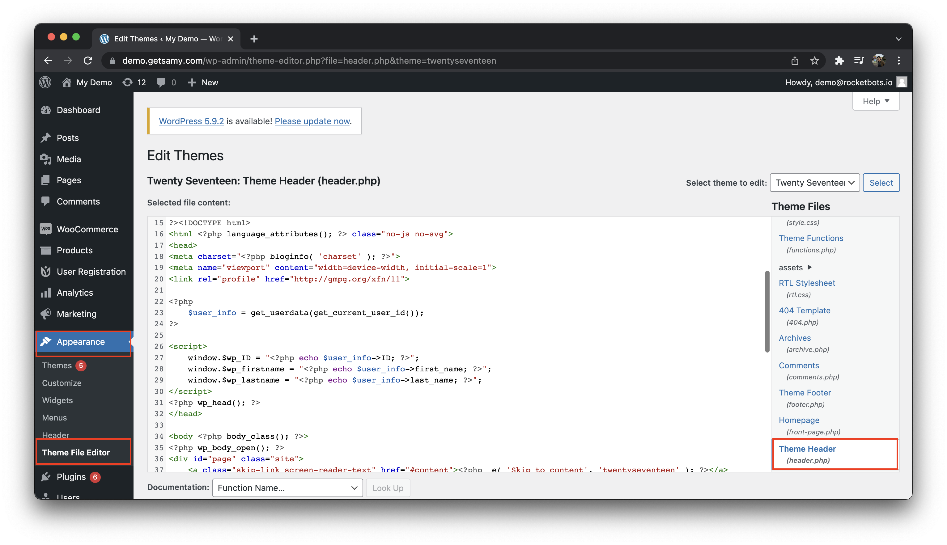 From the left navigation menu, click on Appearance and select the Theme File Editor. Proceed to select the Theme Header file.