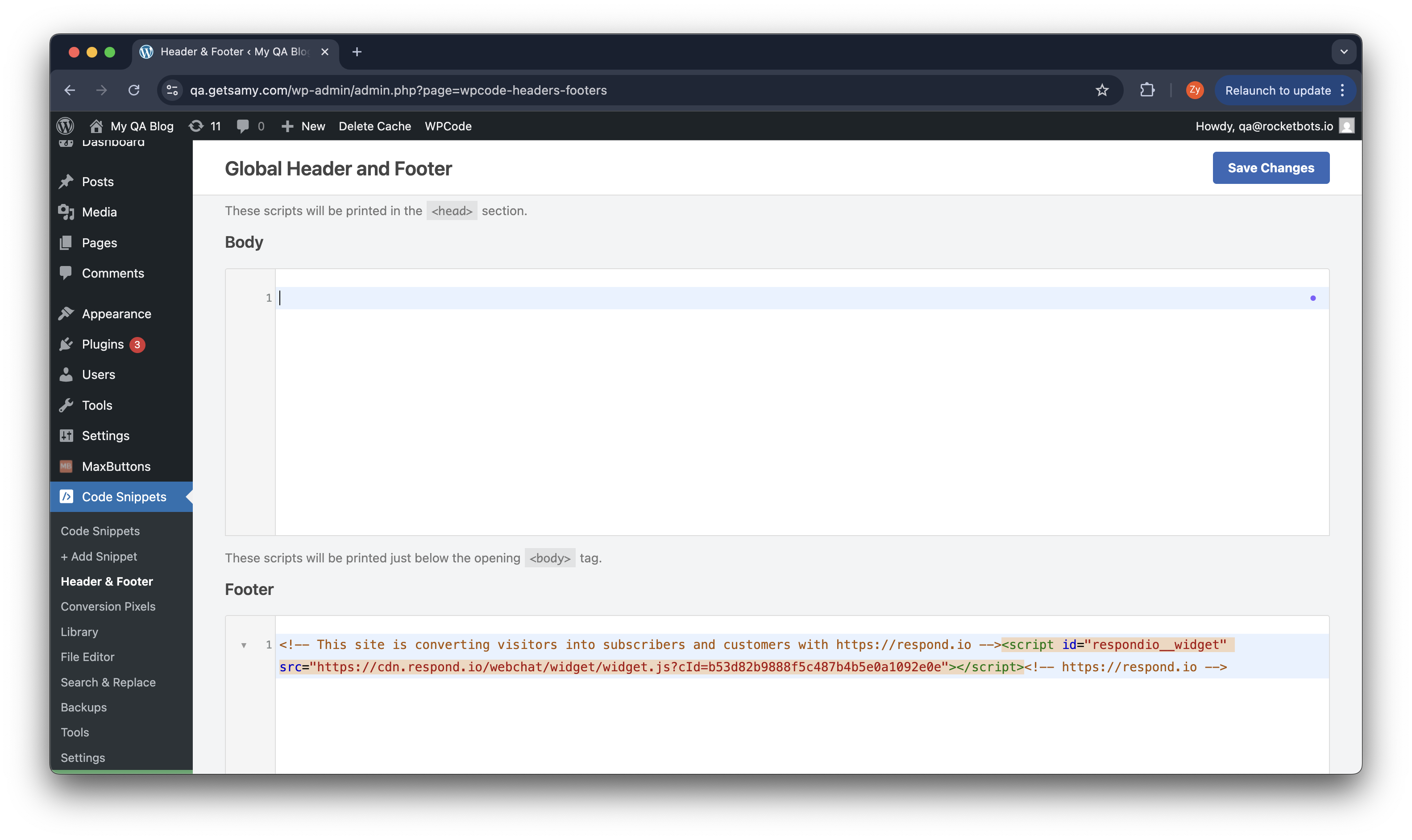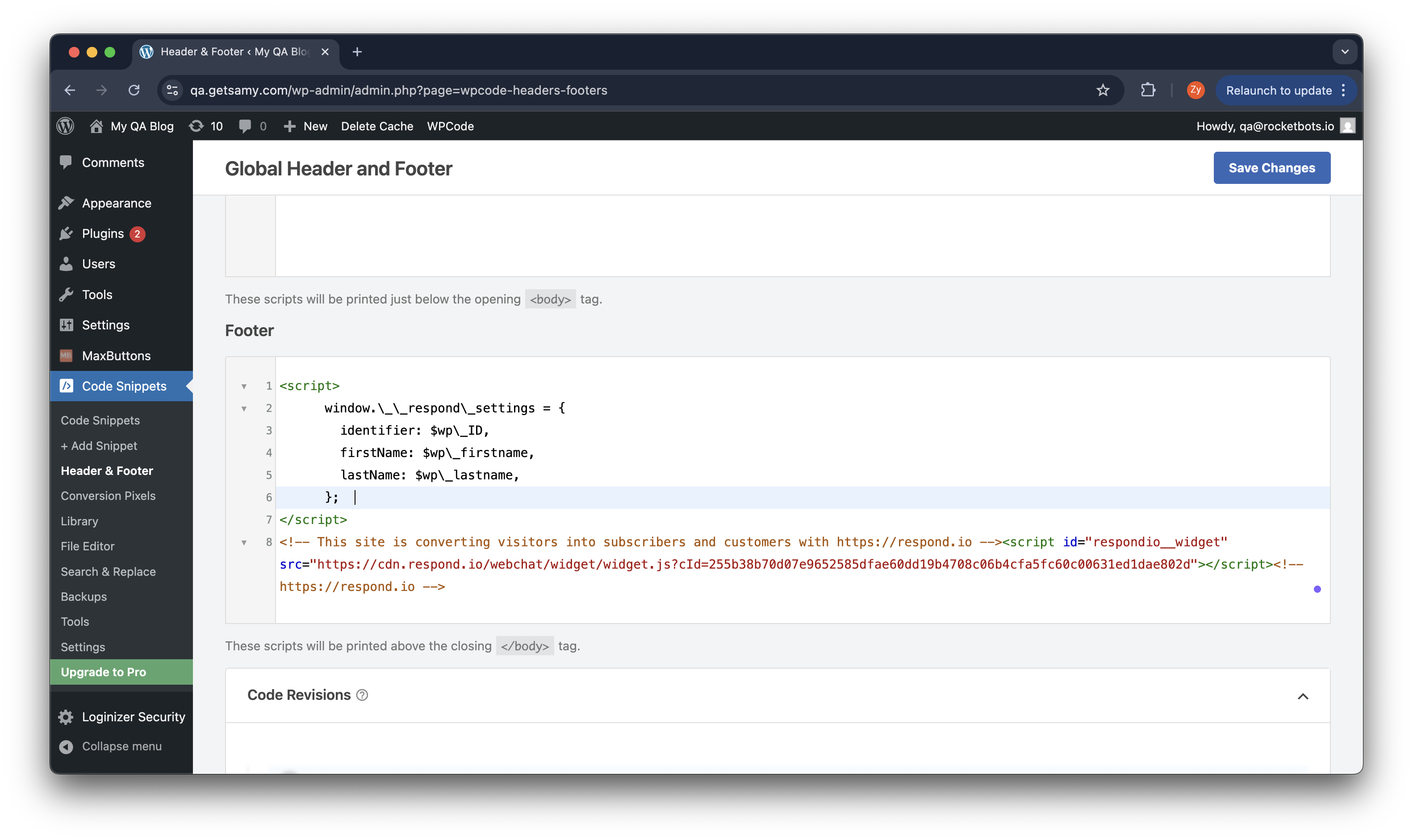 Copy your plugin script from respond.io and paste it into the Script in Footer section of the Header and Footer console page.
