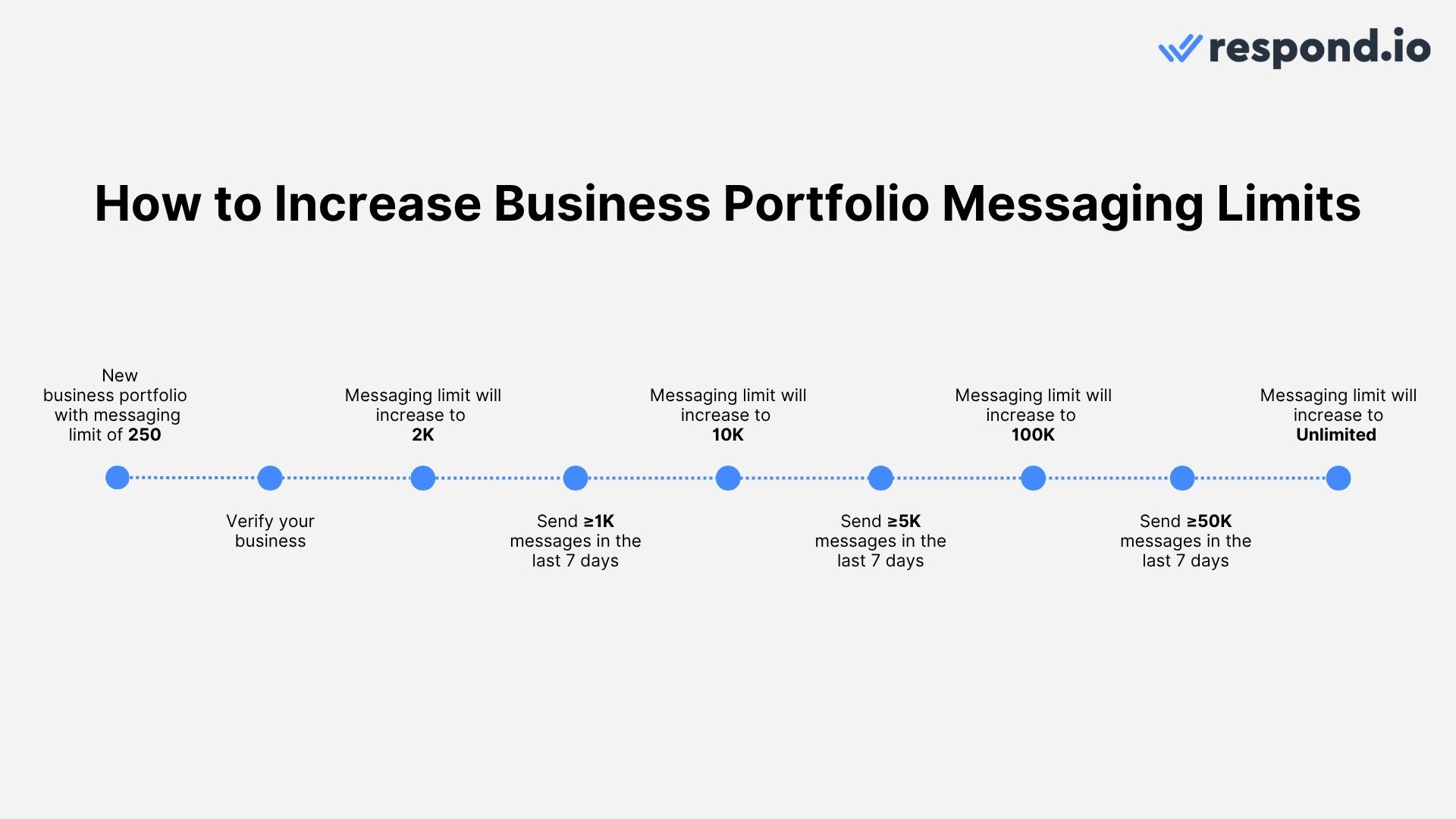 If your business consistently sends high-quality messages across all phone numbers and templates, and meets the usage thresholds at each tier, your messaging limits can scale from 250 → 2K → 10K → 100K → Unlimited in as little as 4 days.