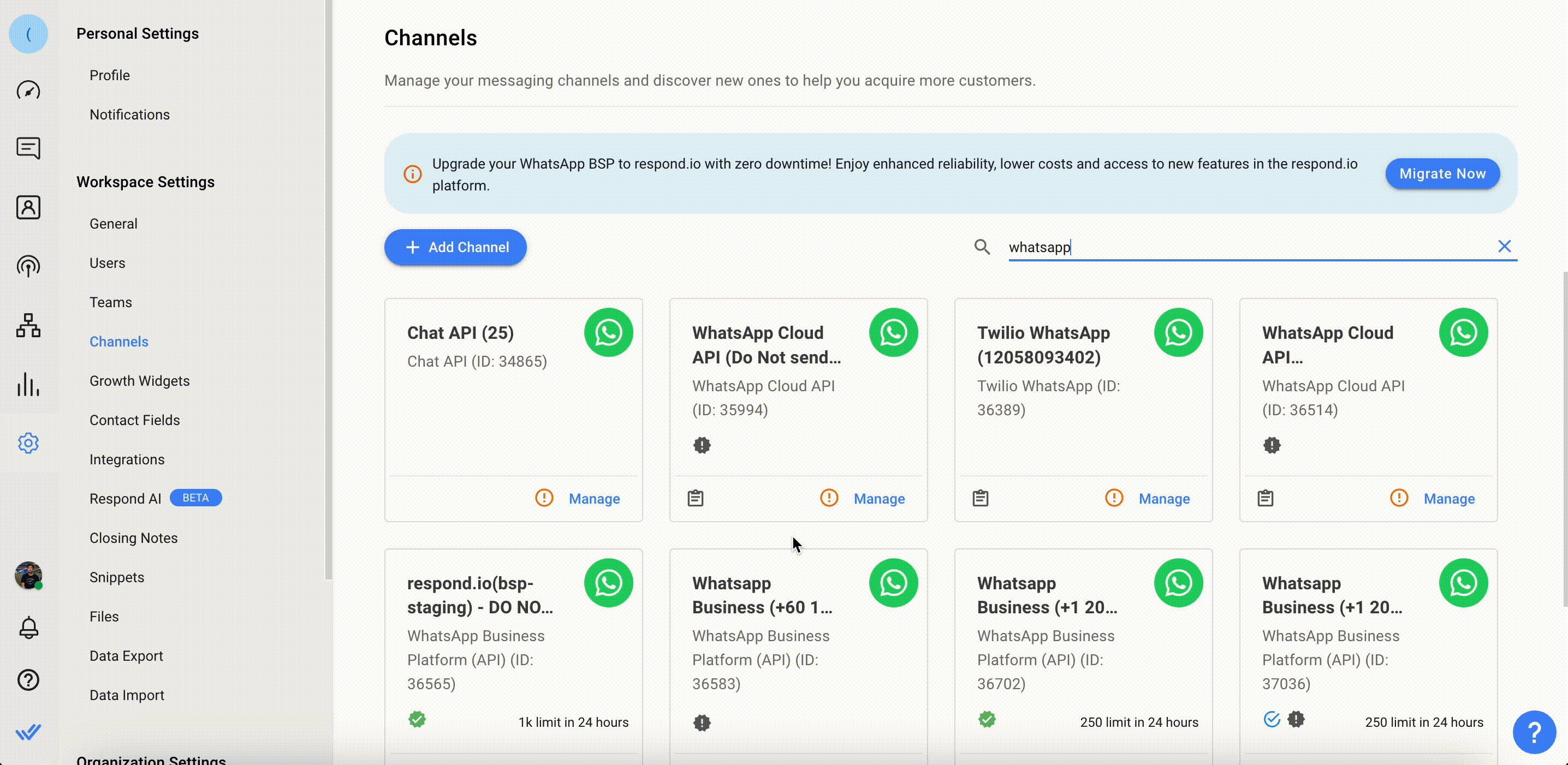 Step 2: Locate the WhatsApp Business Platform (API) channel > Click Manage.