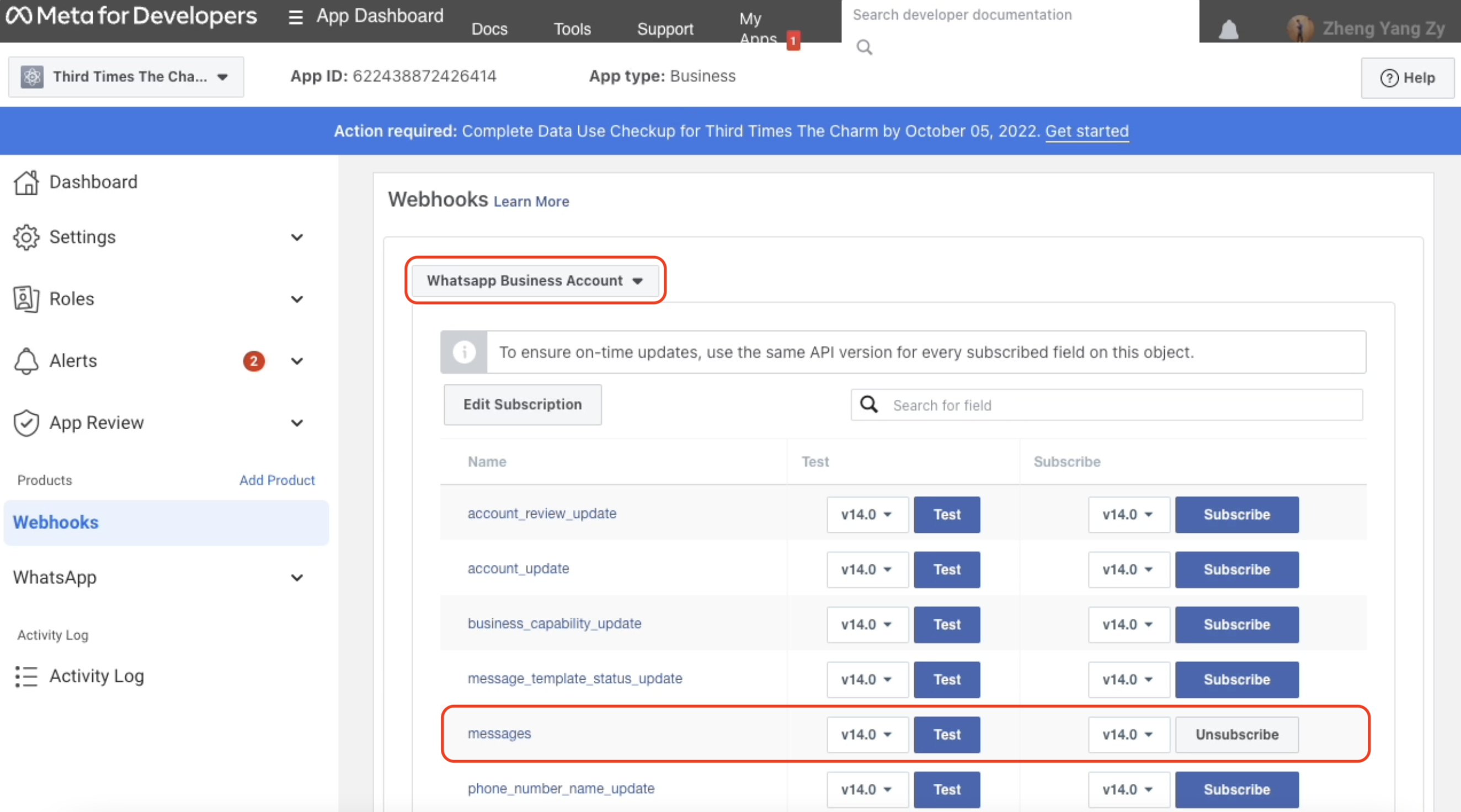 Select WhatsApp Business Account and verify if the messages event is subscribed.