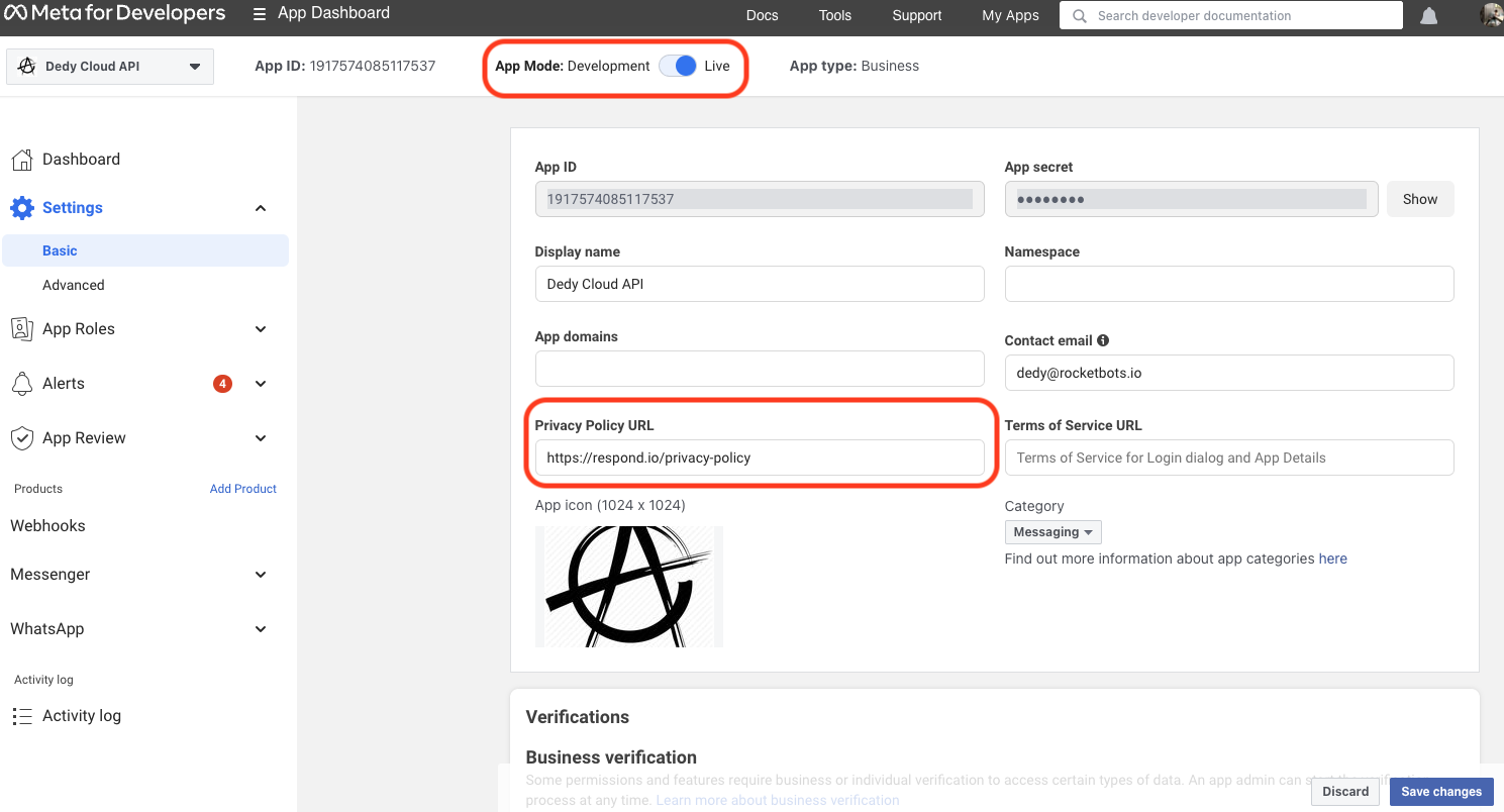Remember to fill in your privacy policy URL. If this is blank, you will not be allowed to turn on live mode.
