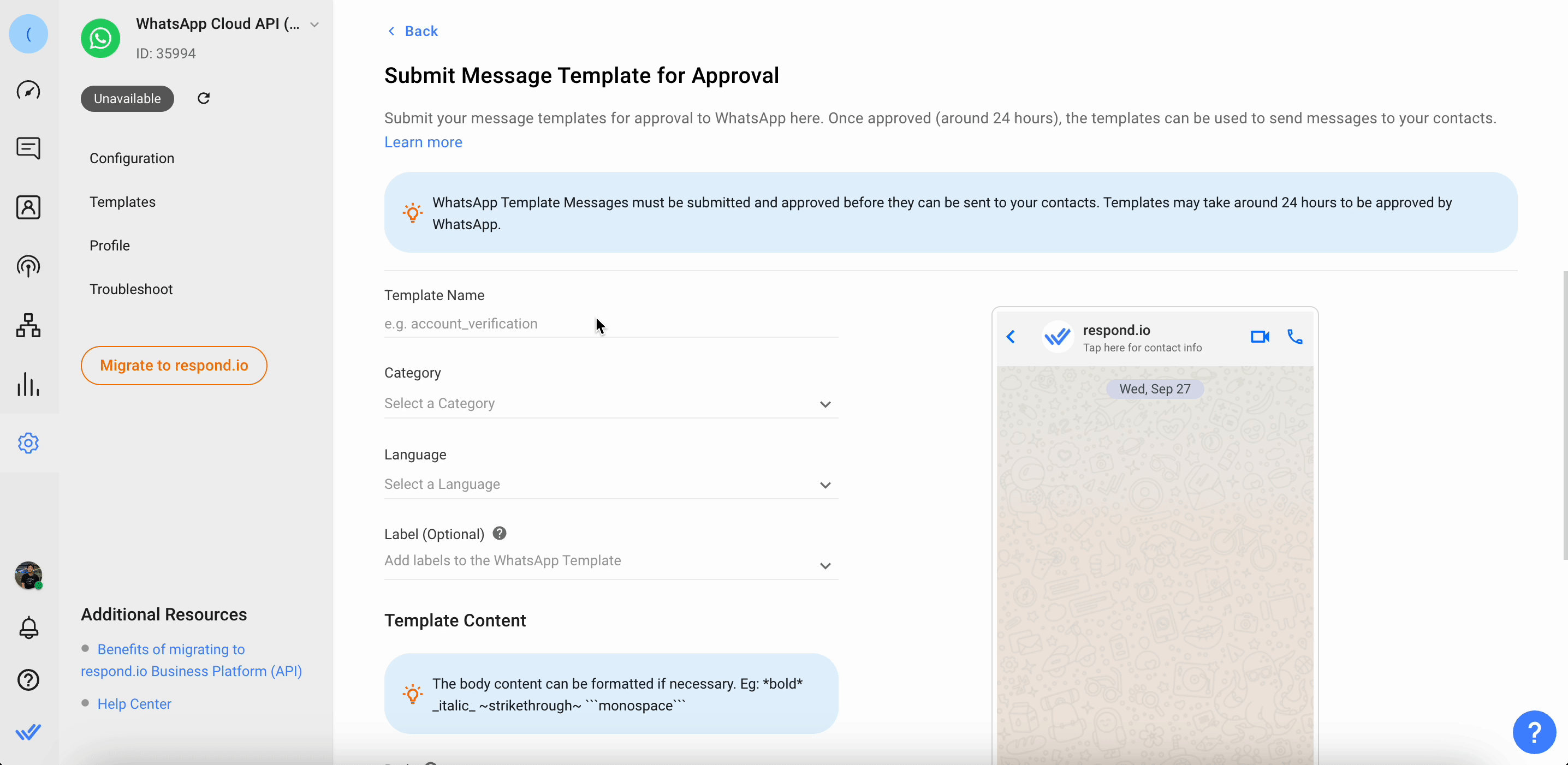 Before sending a message template to a Contact on the respond.io platform, ensure you've done the following: