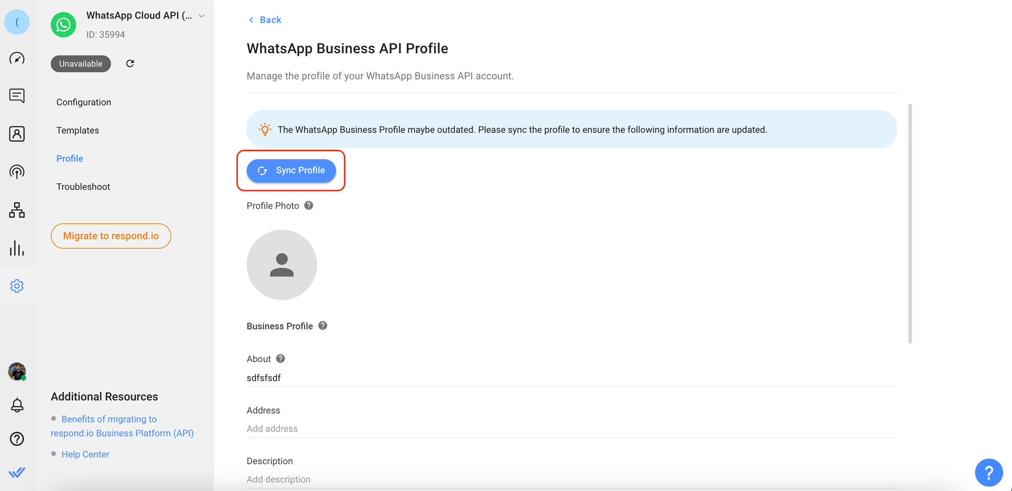 Step 3: Click Sync Profile to obtain the latest WhatsApp Business Profile information from WhatsApp.