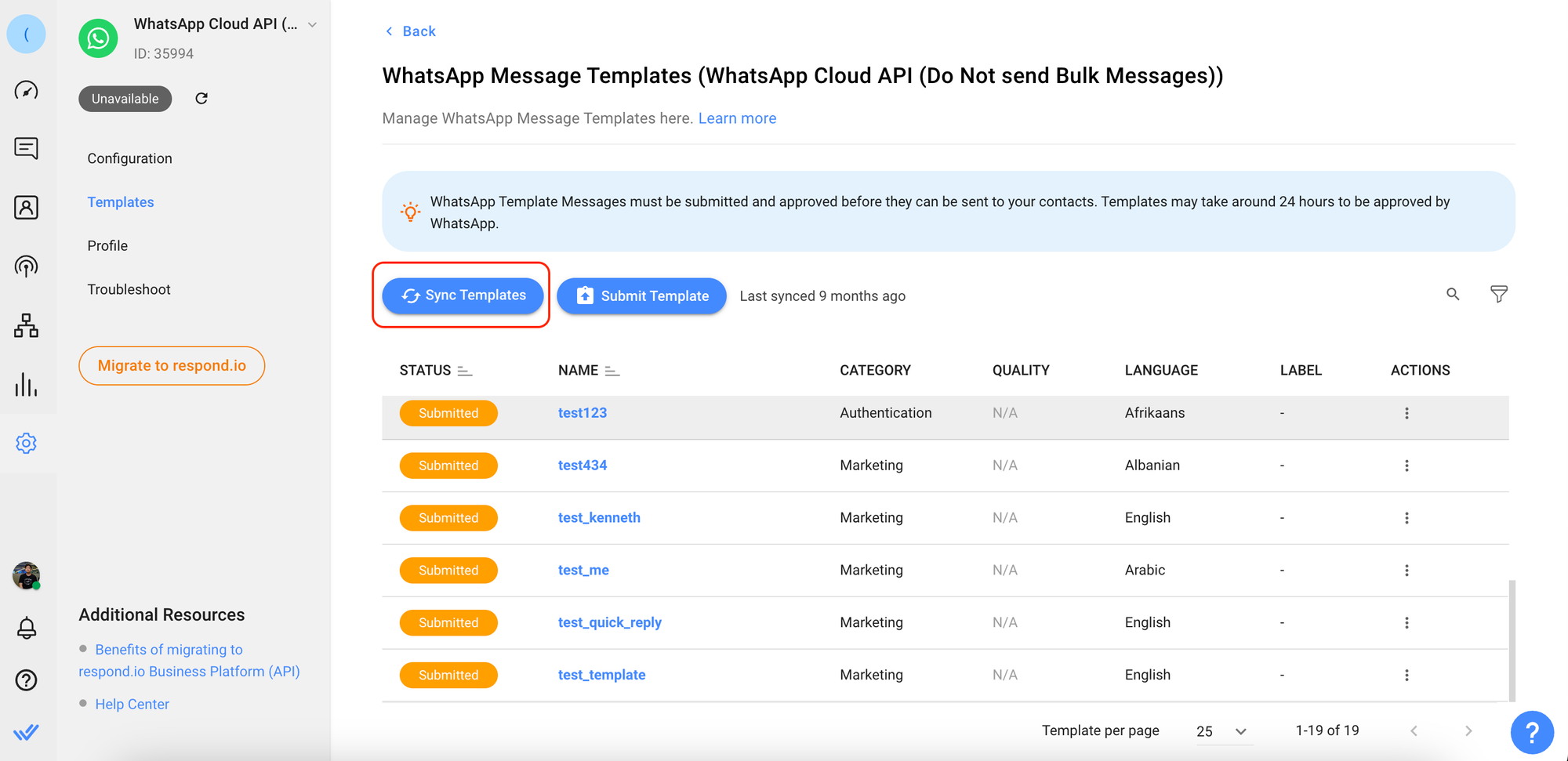 - The message templates will be listed with their corresponding statuses.- The last synced date time will be updated.- If your template is rejected, the rejection reason will be displayed below the rejected message template.