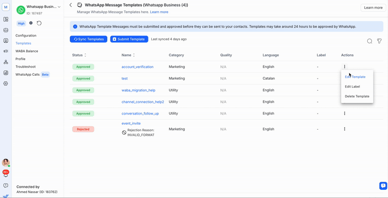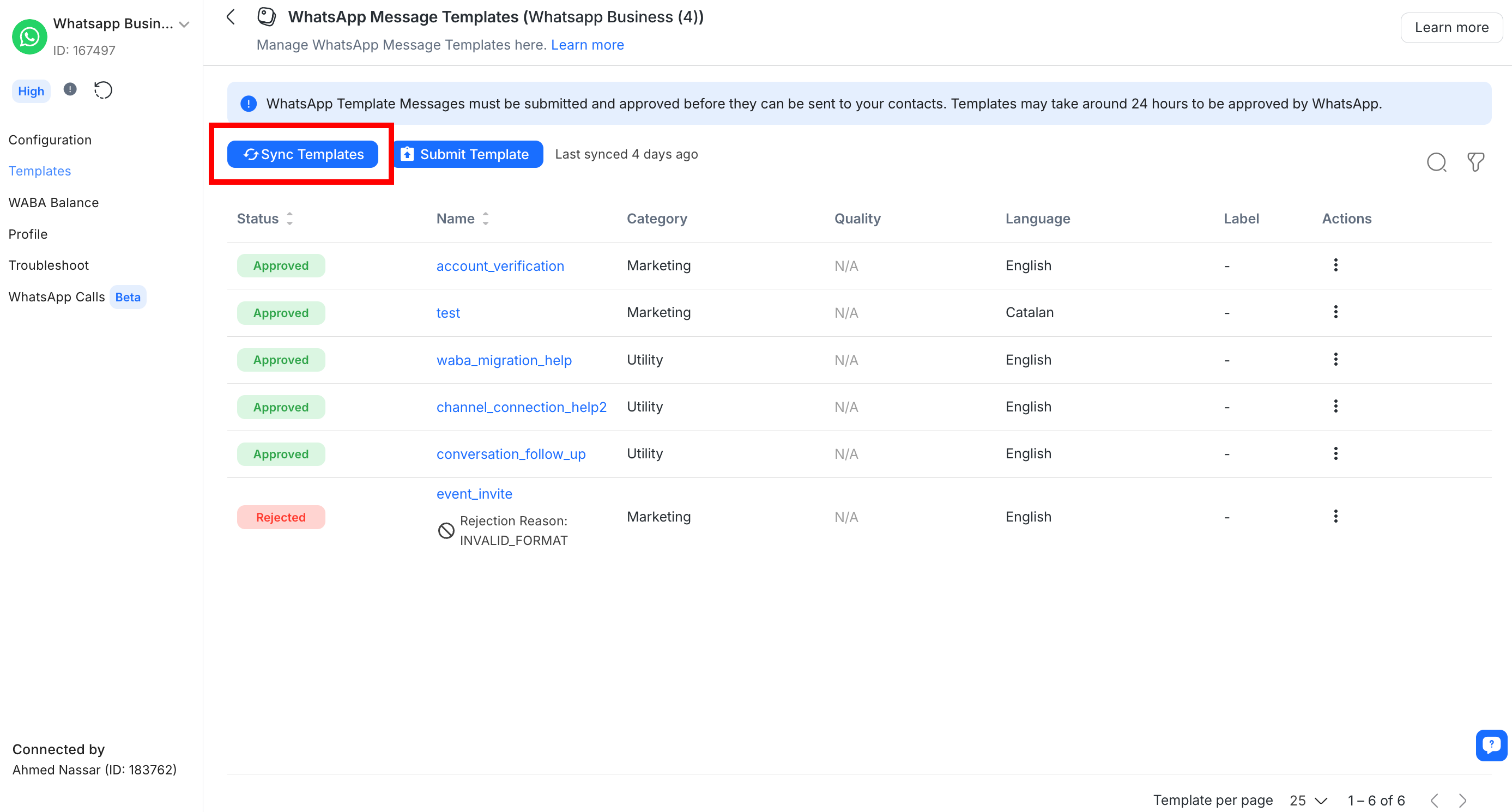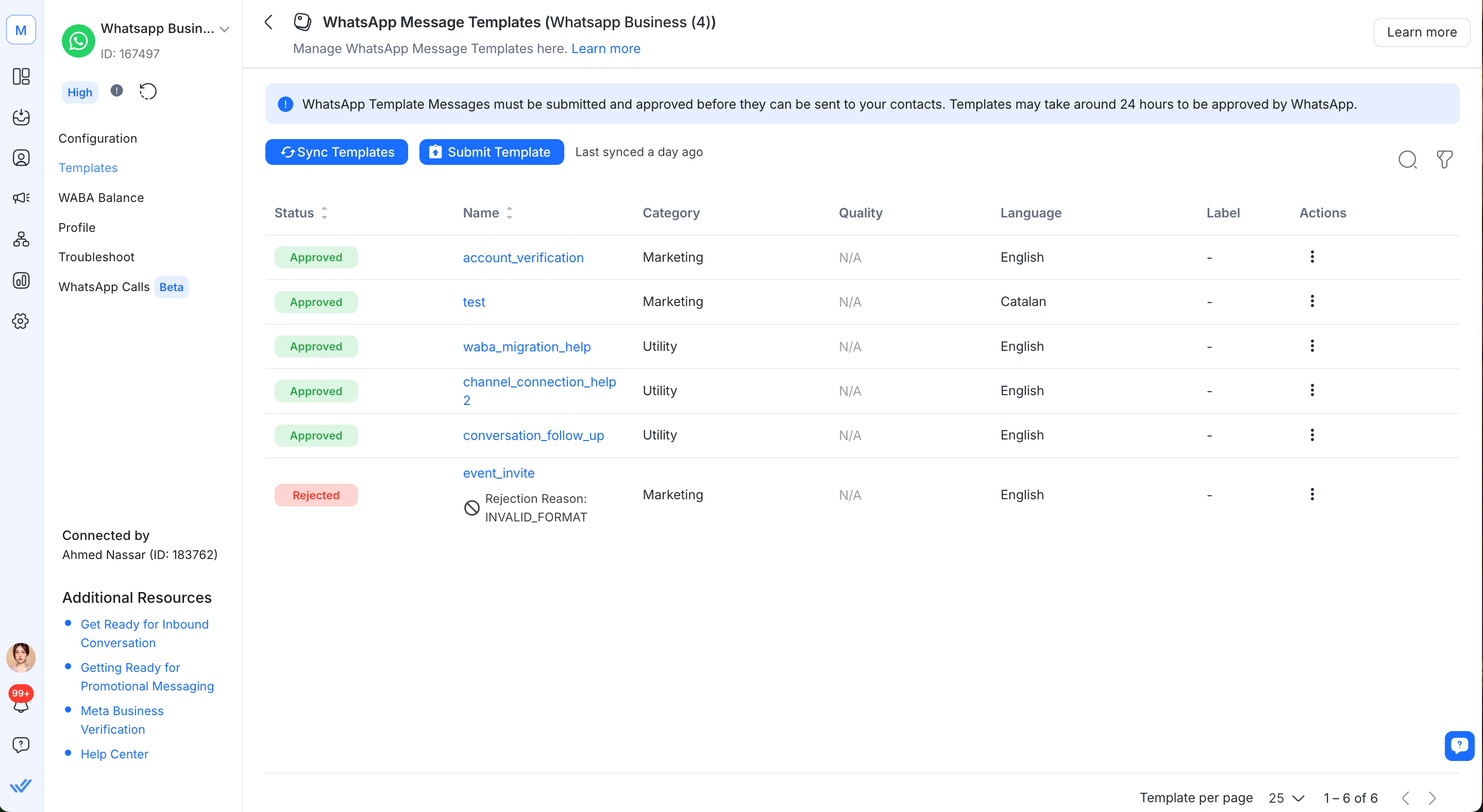 When the syncing is complete, the message templates will be listed with their corresponding statuses, quality ratings and the last synced date time will be updated. The rejection reason will be displayed below the rejected message template.