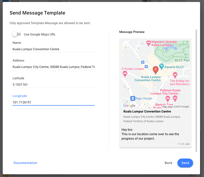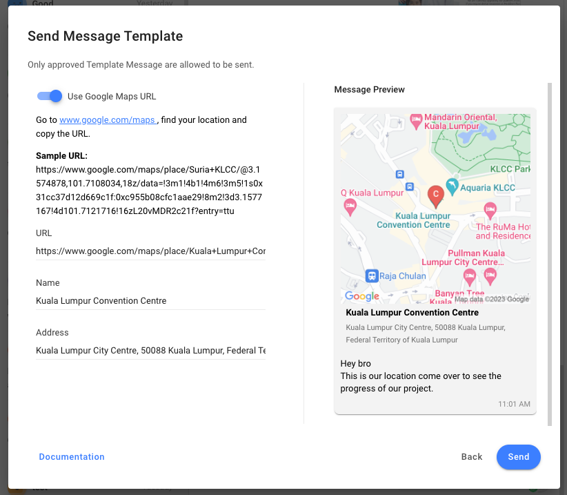 Use Google Maps URL: Copy the Google Maps URL that you want to send and paste it into the URL field.