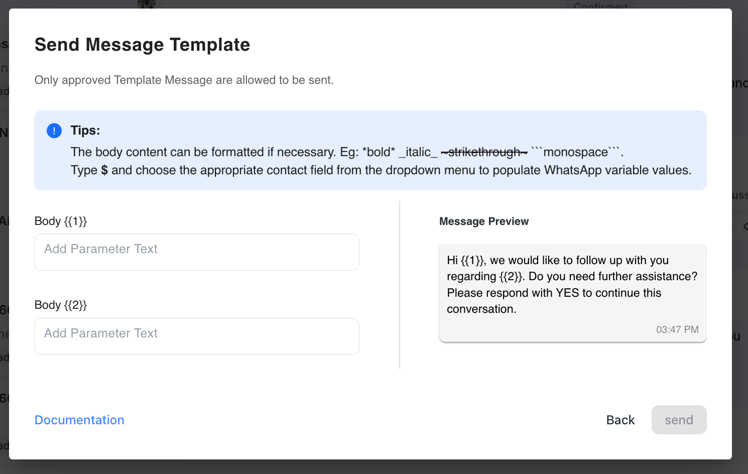 When a user is typing the values for the parameters, the parameters in Message Preview will be replaced with the values for users to review before sending it to the Contact.