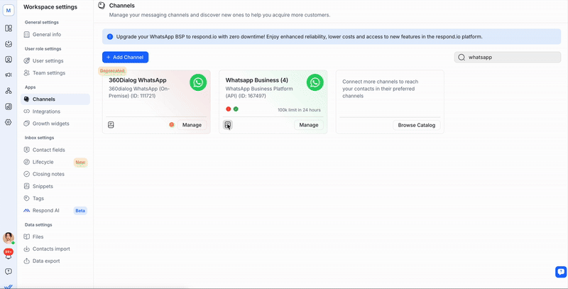 Step 2: Locate the WhatsApp Business API channel > click Manage.