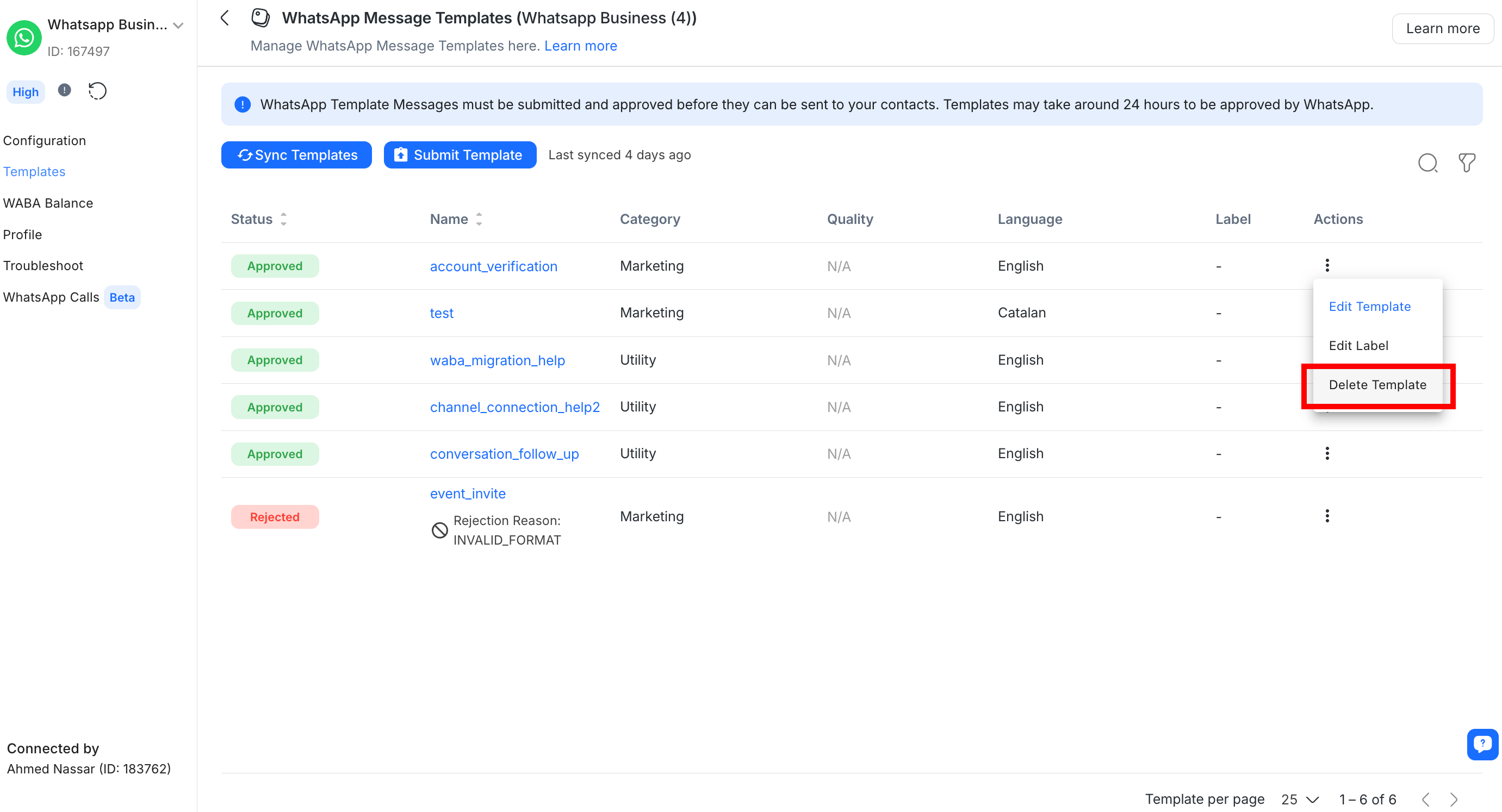 Once you have submitted your message template for approval, you must wait approximately 24 hours for the approval process to be completed. Check your template status on the platform by navigating to Settings > Channel > your connected WhatsApp Channel > Templates. Then, sync your template to get the latest status update.