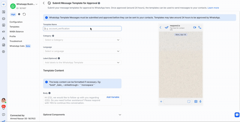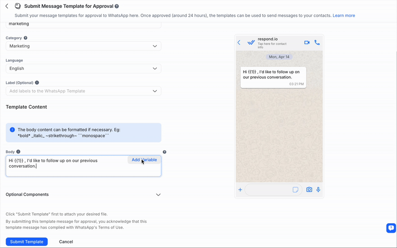 Learn more about WhatsApp Message Template content and formatting rules here.