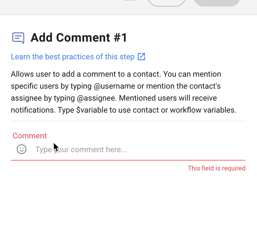 Write your desired comment in the text field. You can add a Variable using $ or tag another user using @. To tag the current assignee, type @assignee.