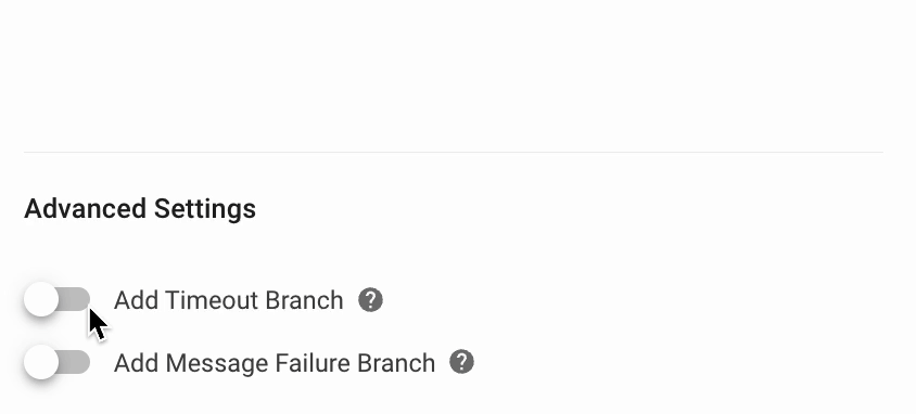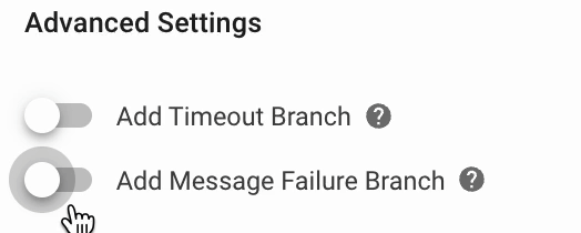To handle failed messages, turn the Add Message Failure Branch toggle ON. Messages with invalid or unmatched answers will be directed to the Failure Branch.