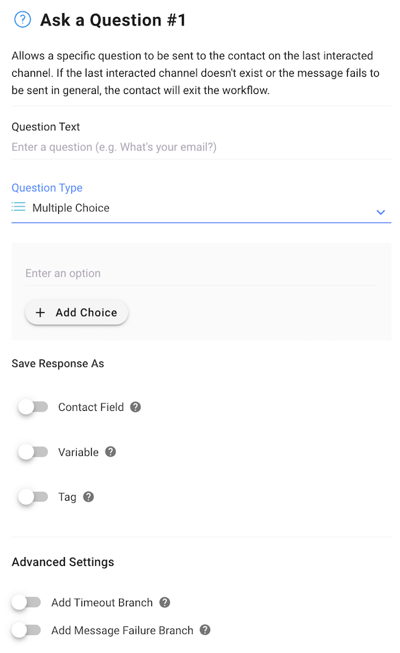 This Step sends a question to the Contact on the Last Interacted Channel if all conditions are met.
