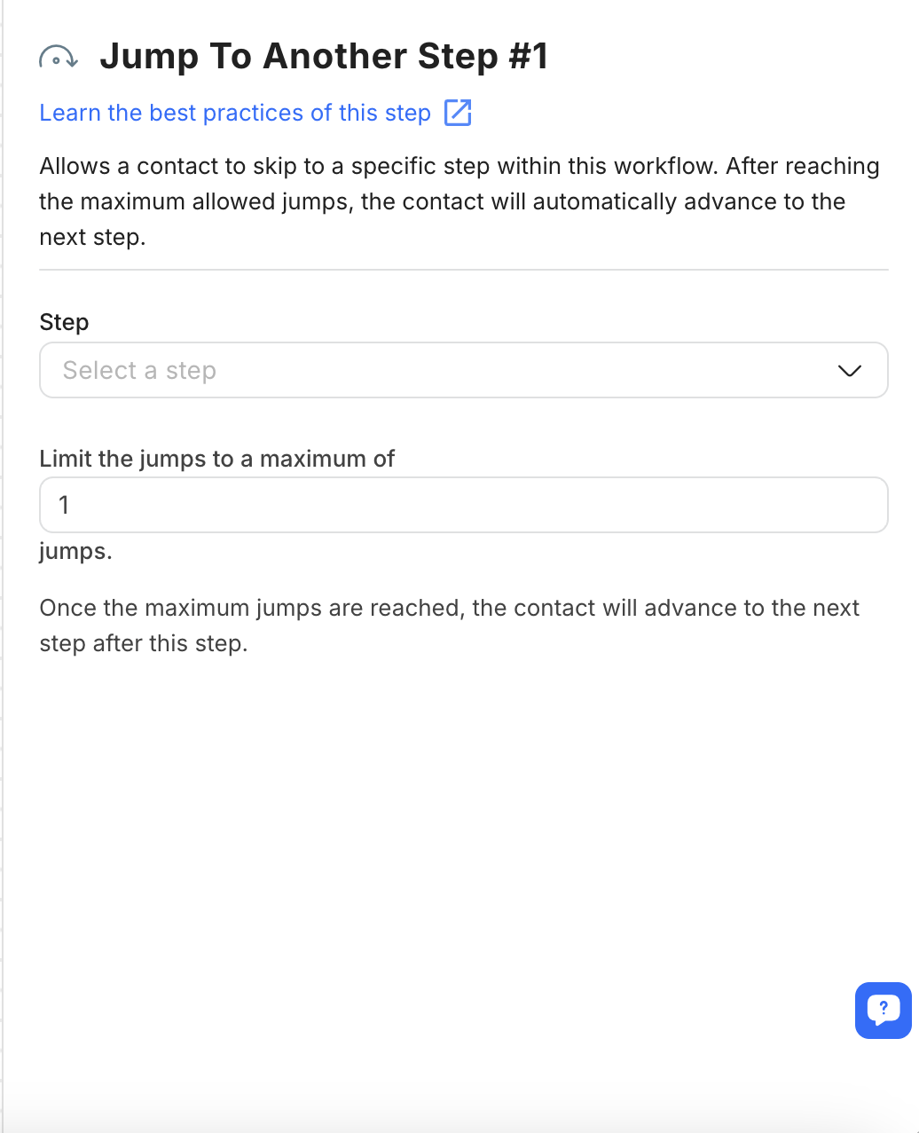 Once the maximum is reached, the Contact will skip the jump on the next attempt and move to the next specified Step after the Jump Step. If there's no next Step, the Contact will exit the Workflow.