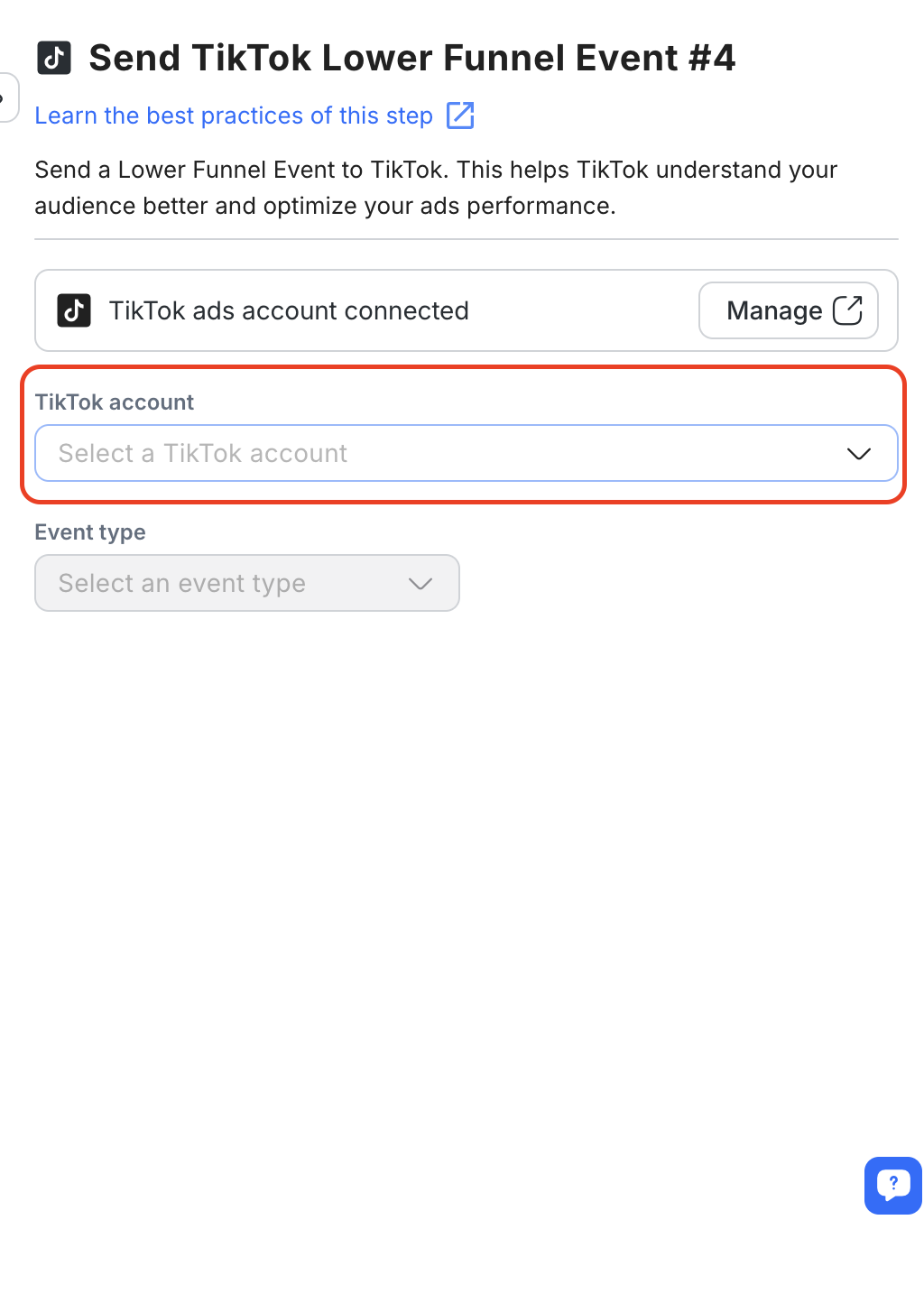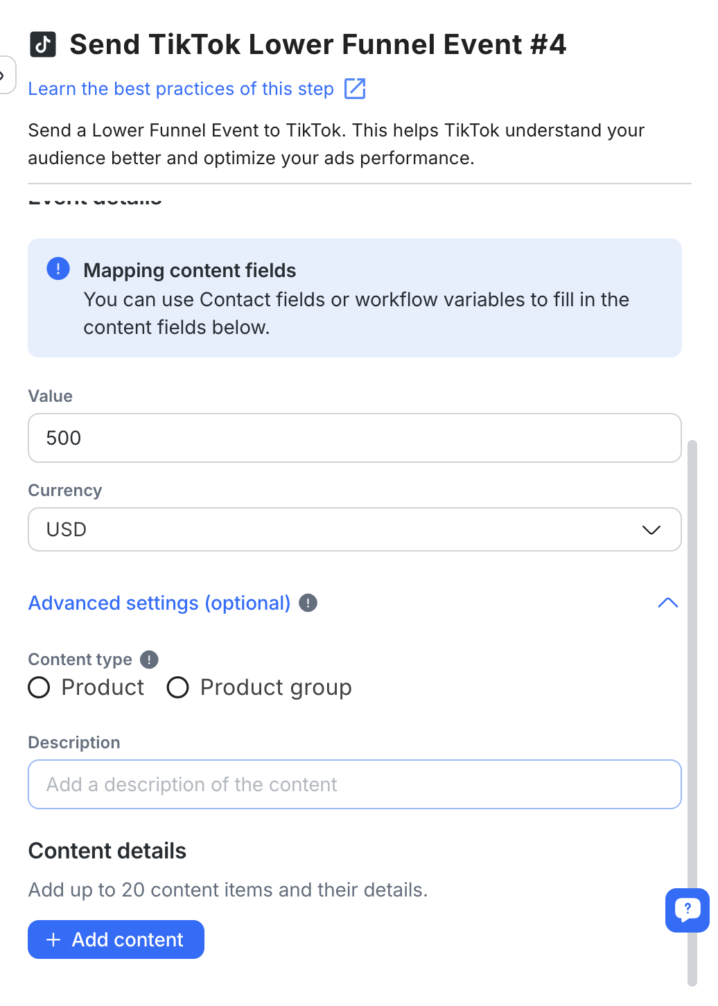 The Send TikTok Lower Funnel Event step lets you send conversion data to TikTok based on specific actions within a workflow. When the workflow reaches this step, the event data is sent directly to TikTok, improving ad performance and audience targeting.