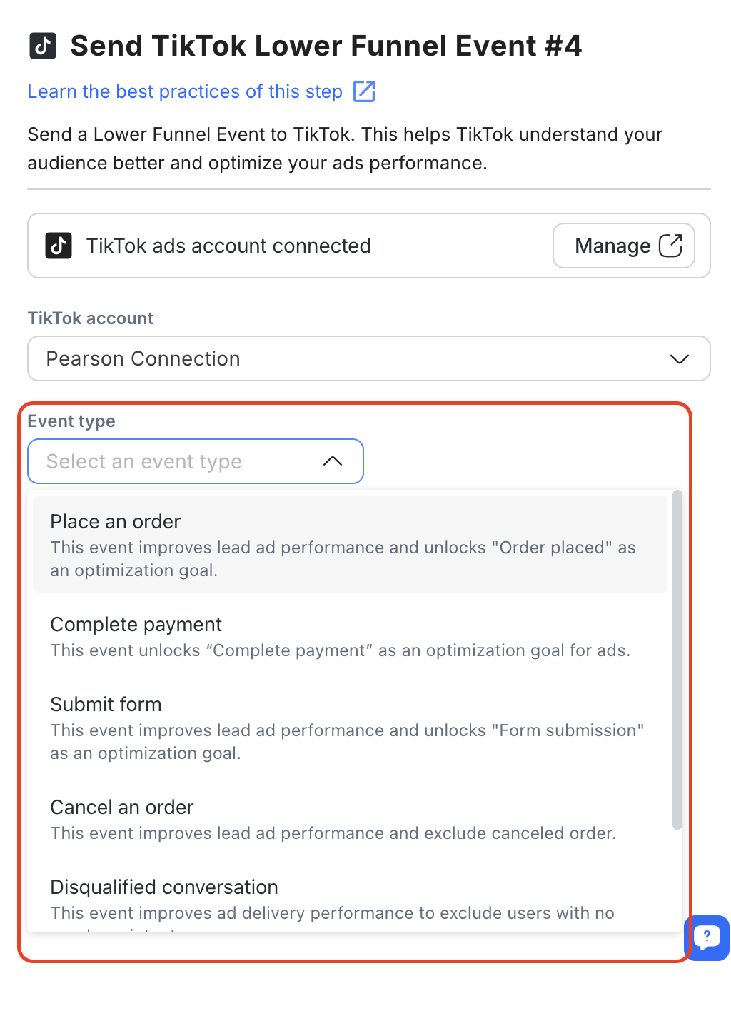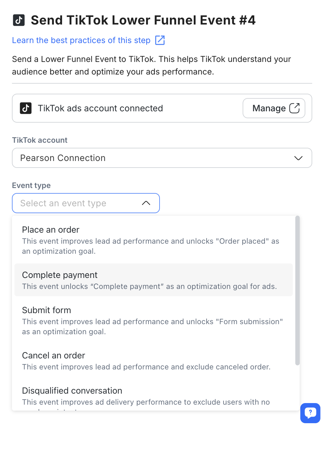 Lead management: Use this step to send leads generated from ads directly to TikTok, allowing you to optimize lead-generation campaigns.