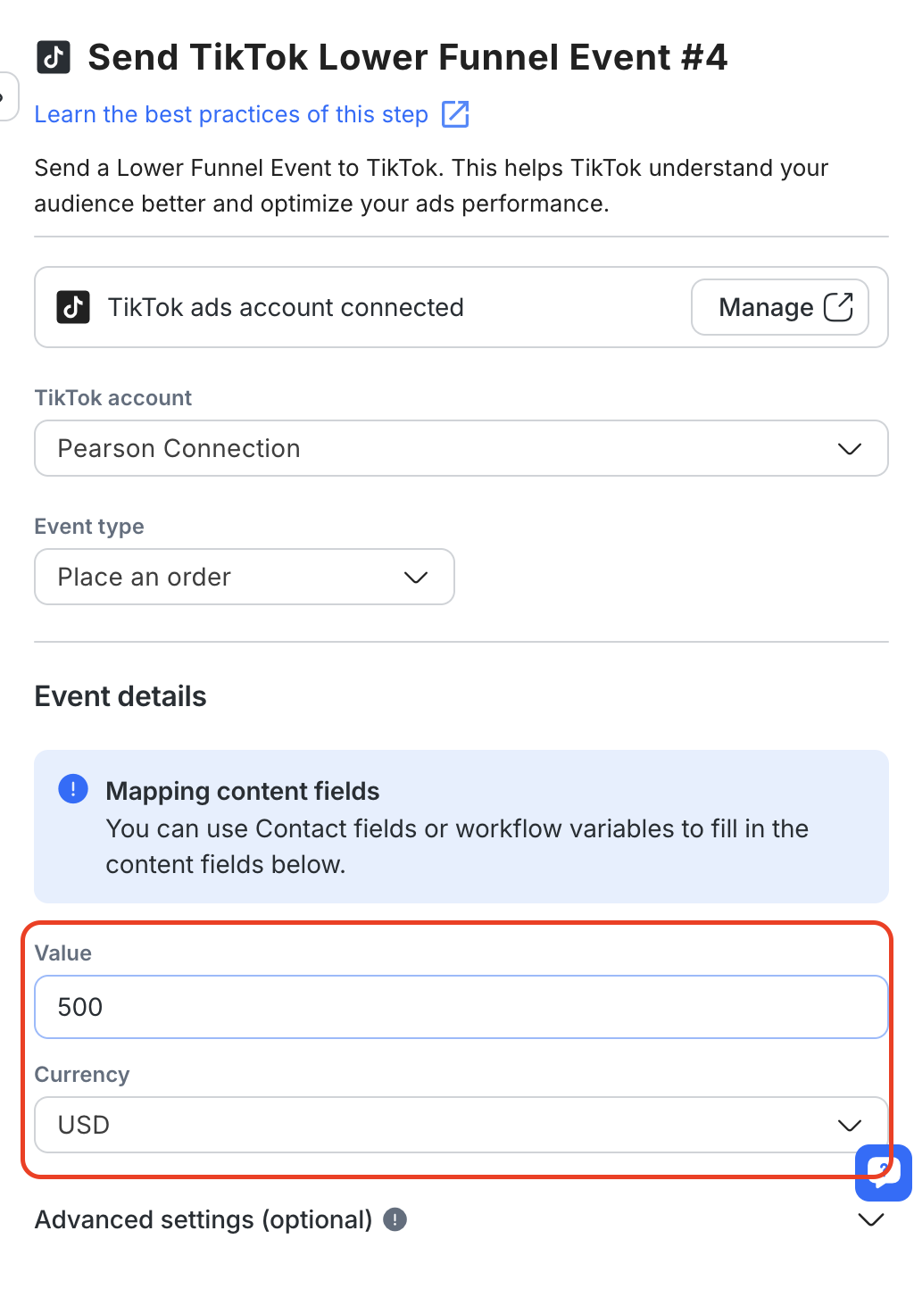 When setting up the Send TikTok Lower Funnel Event step, you need to configure the following fields: