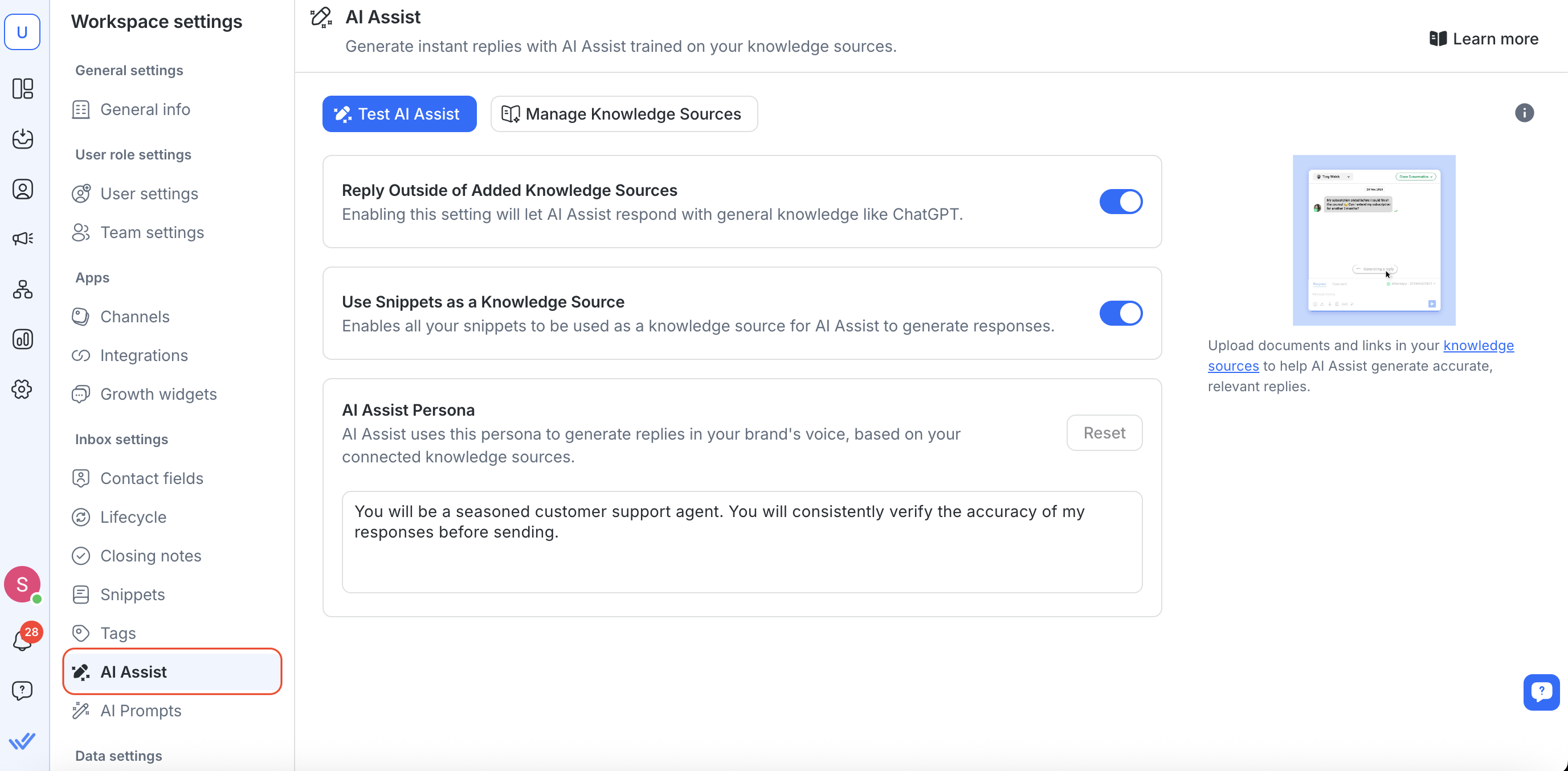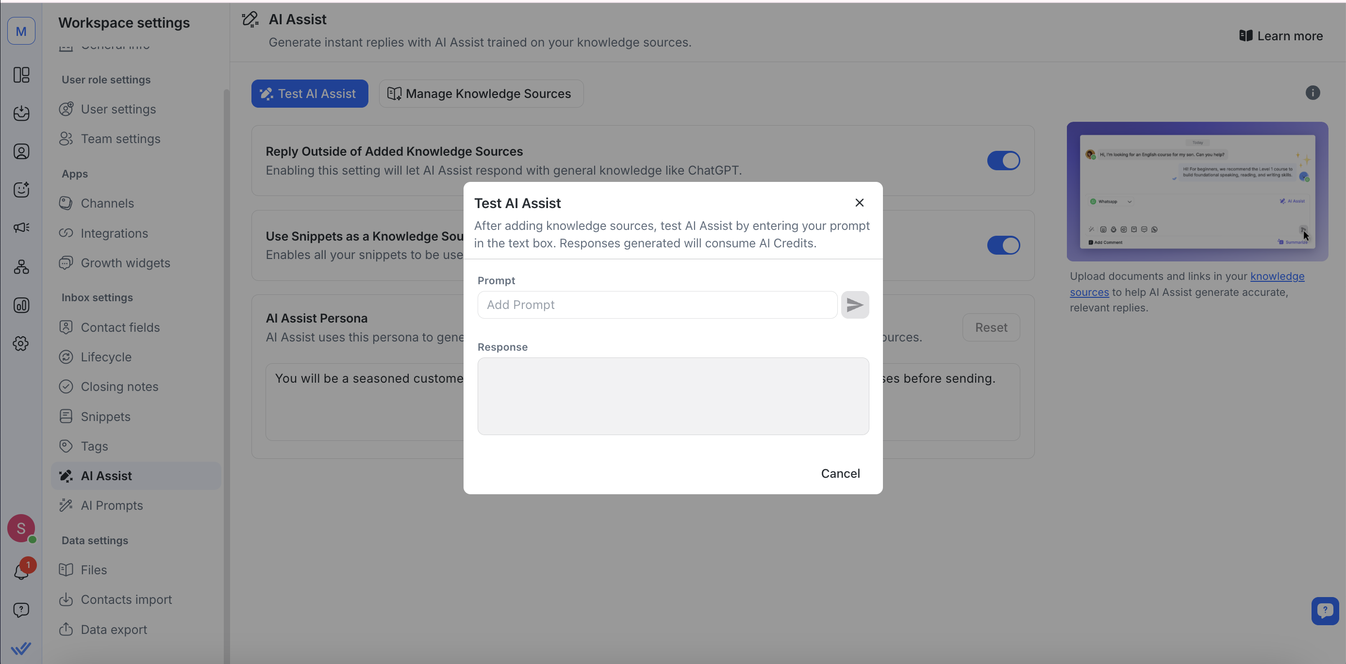 AI Assist lets you generate instant, context-aware replies to incoming customer messages by leveraging your own knowledge sources (PDFs, URLs, Snippets). It can also optionally base responses on general knowledge when no related content exists in your knowledge sources.