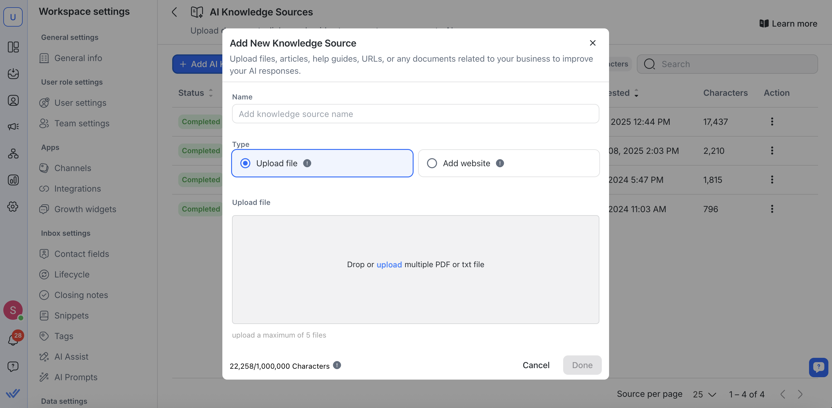 Upload PDFs, provide public URLs, or add Snippets that reflect your company’s documentation, FAQs, product guides, etc.
