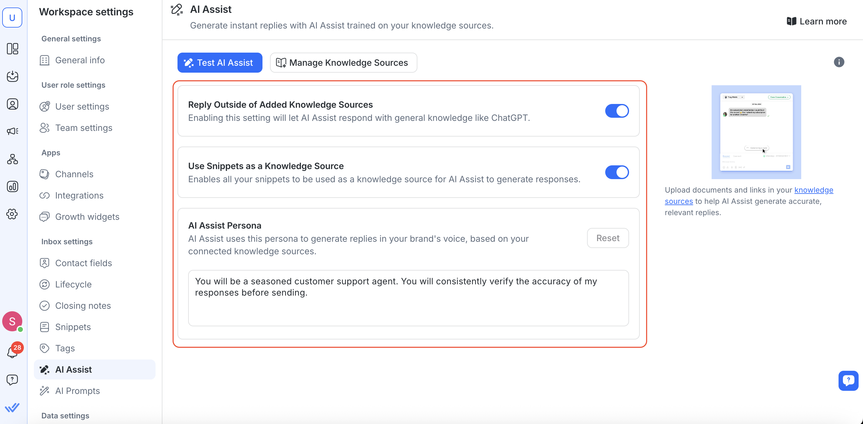 When enabled, AI Assist will base responses on general knowledge if it can’t find an answer in your uploaded sources.