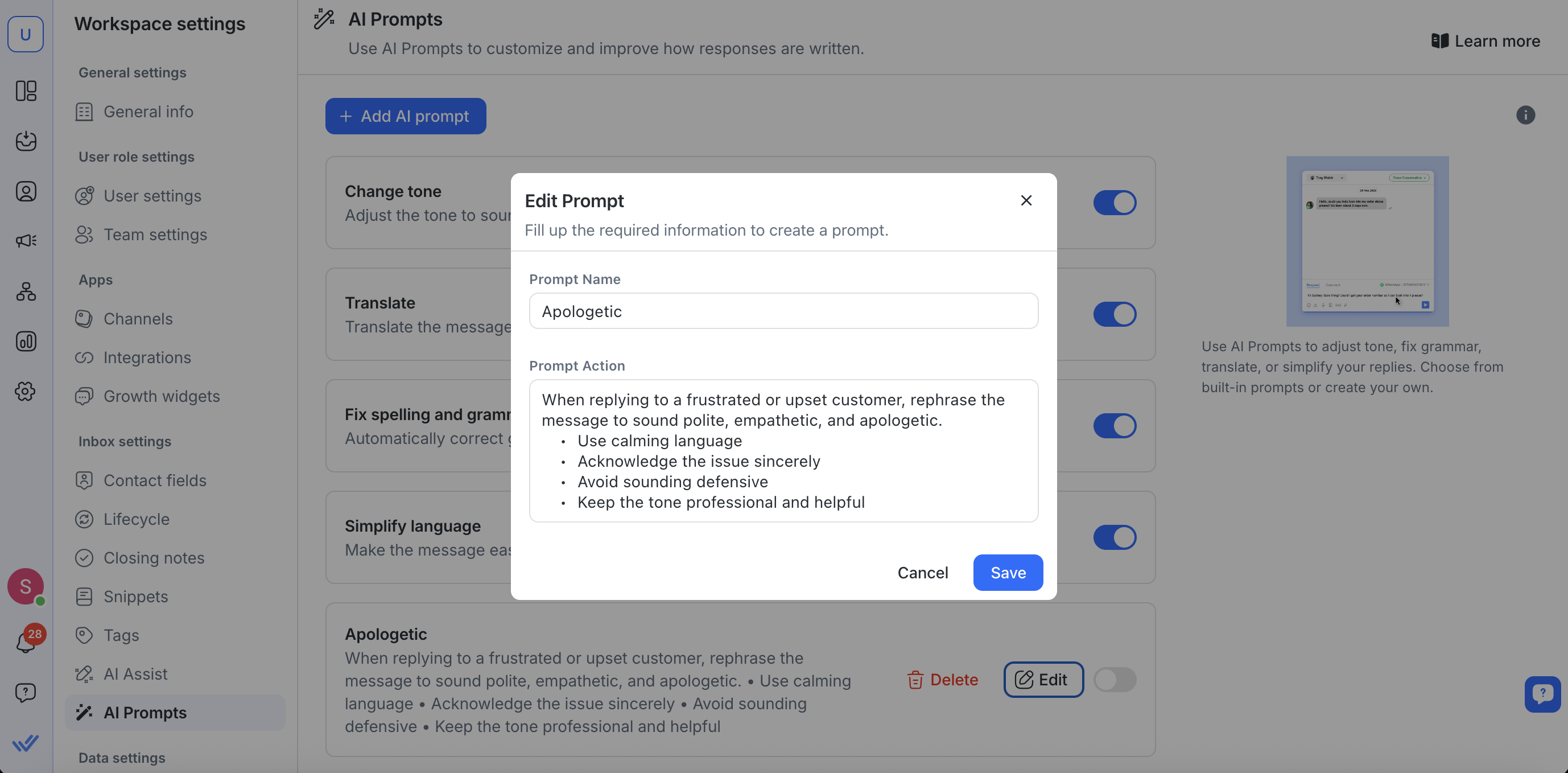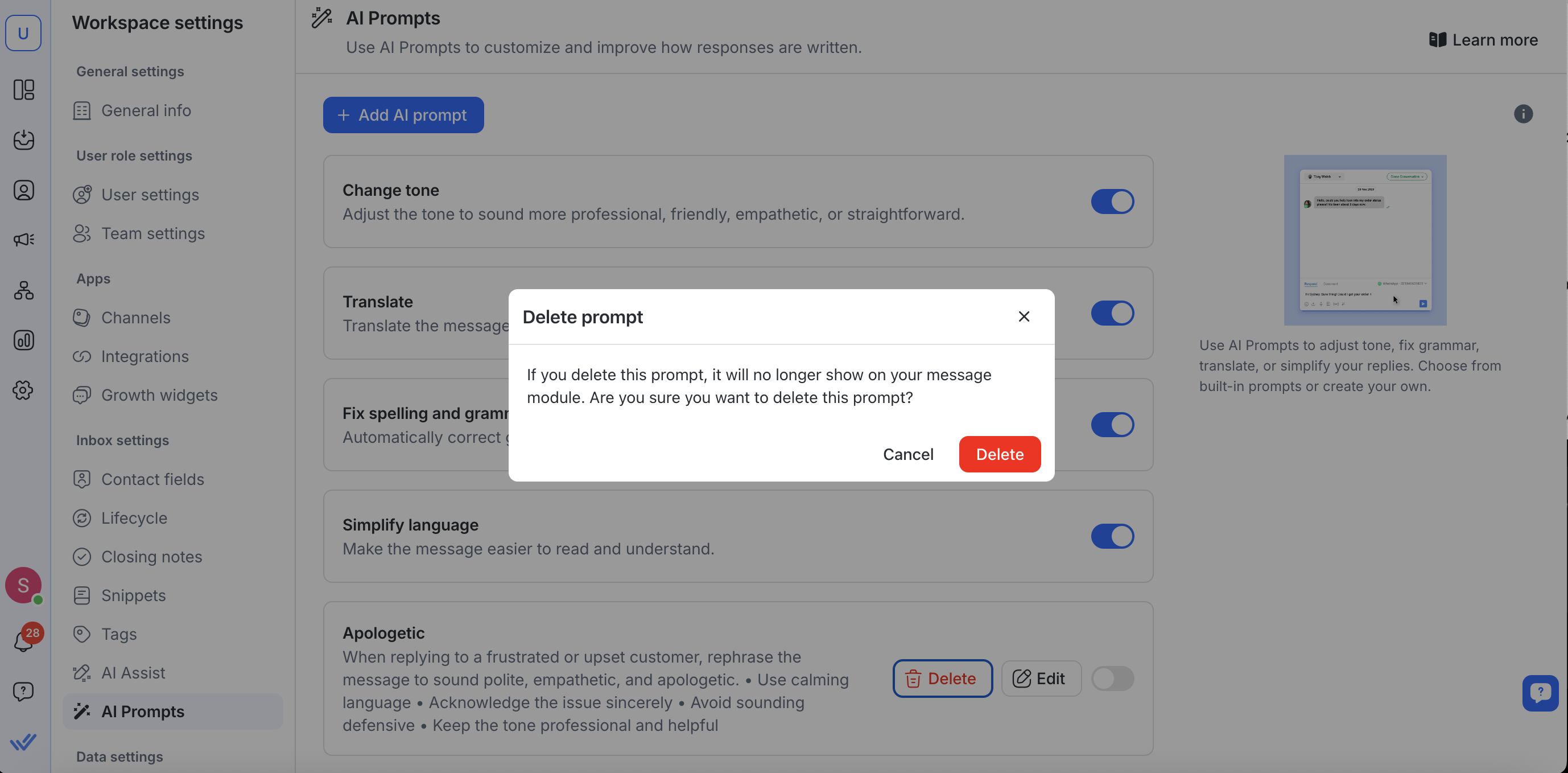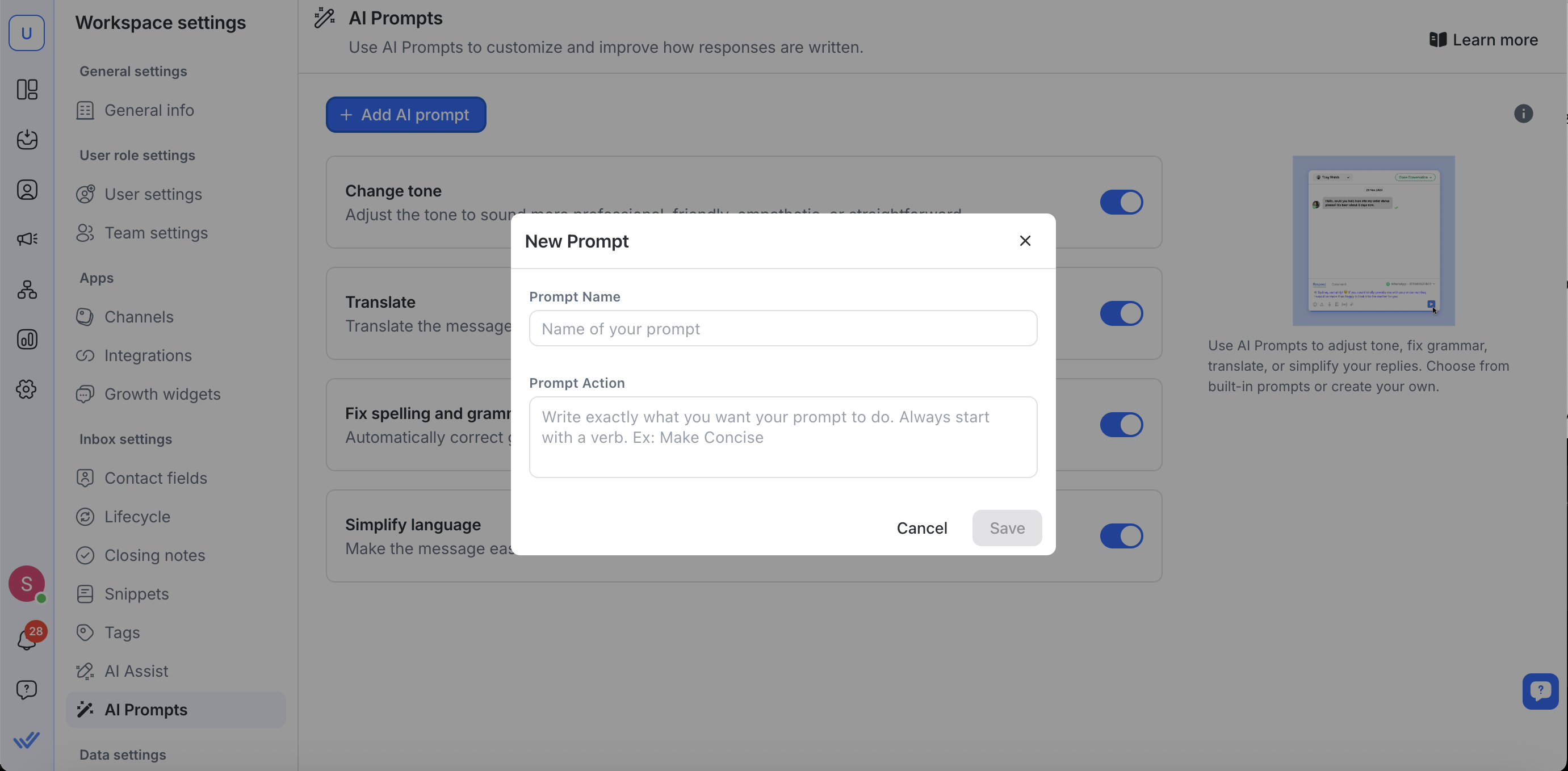 From Workspace Settings, click AI Prompts (under Inbox Settings).