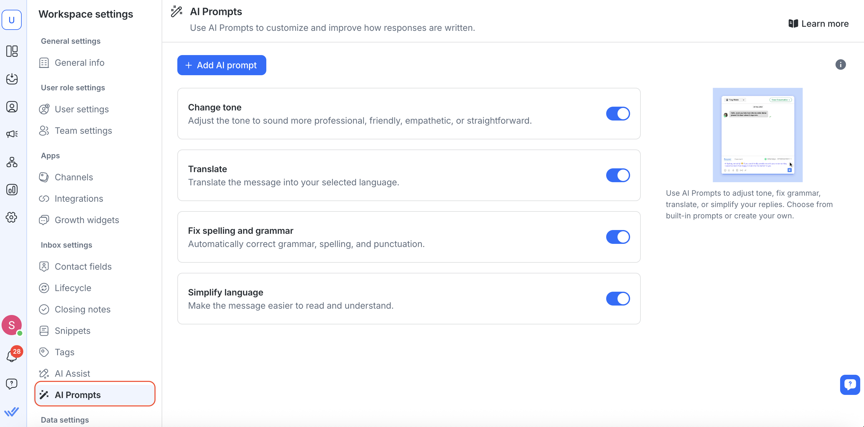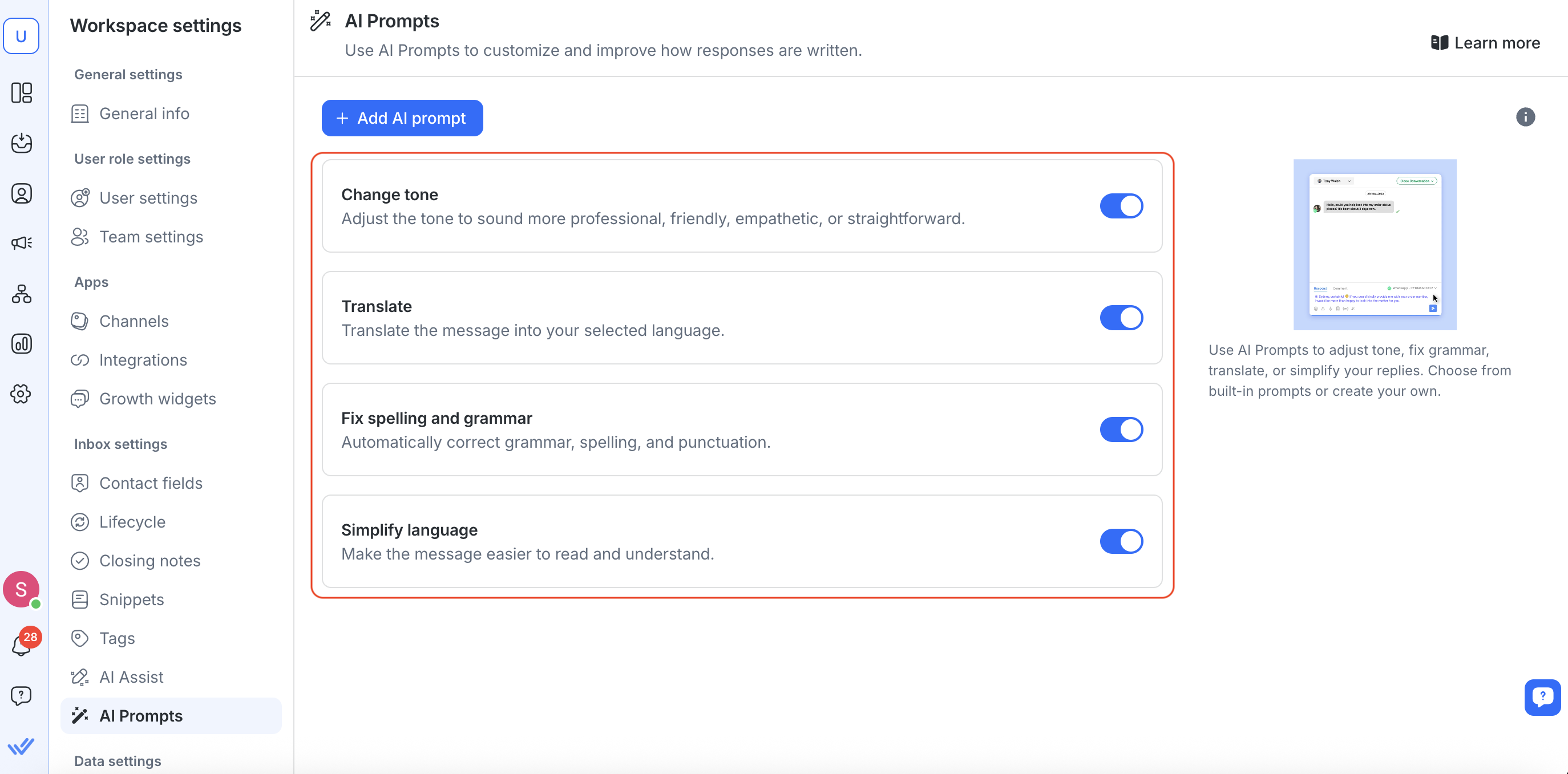 AI Prompts let you tweak how your replies are written. Out-of-the-box, AI Prompt comes with four built-in options; you can also create up to four custom prompts. Once enabled, these prompts are available directly in the Messaging Console in your Inbox.