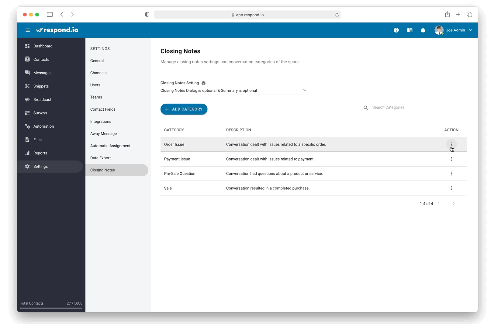 If you need to make a change to an existing category, you can do so by choosing Edit from the Actions menu. Bear in mind that you can only edit the description of a Conversation Category.