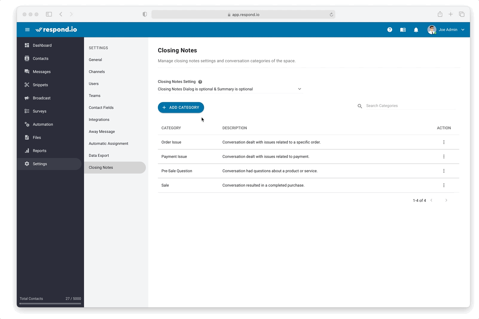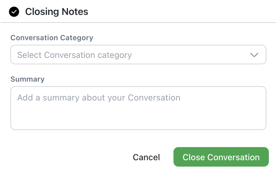 Users are required to close each conversation with a Closing Note. They have to select a Conversation Category. However, the Summary is optional.