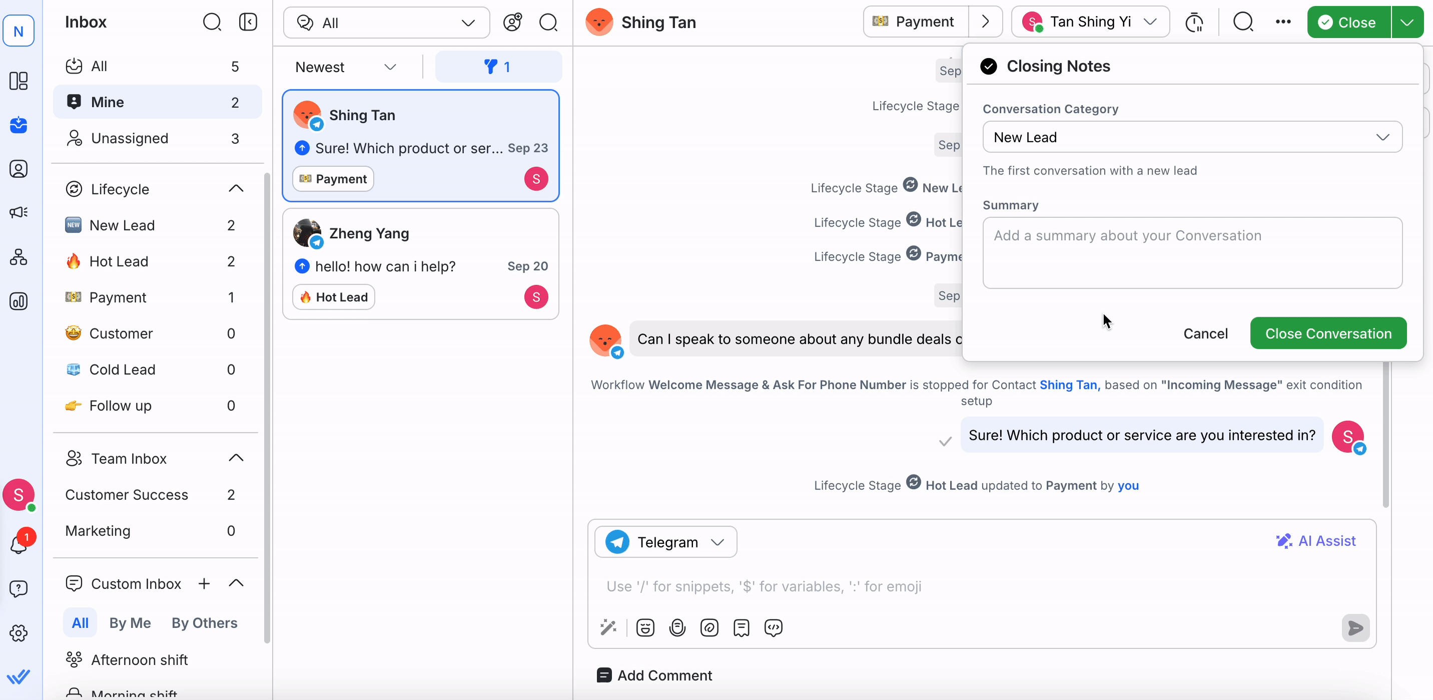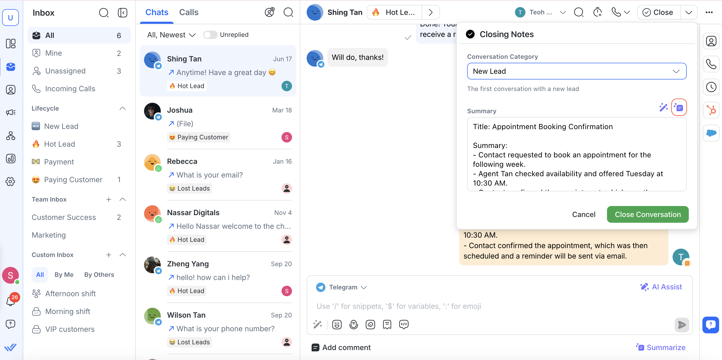Users are required to close each conversation with a Closing Note. They are required to select a Conversation Category and input a conversation summary.