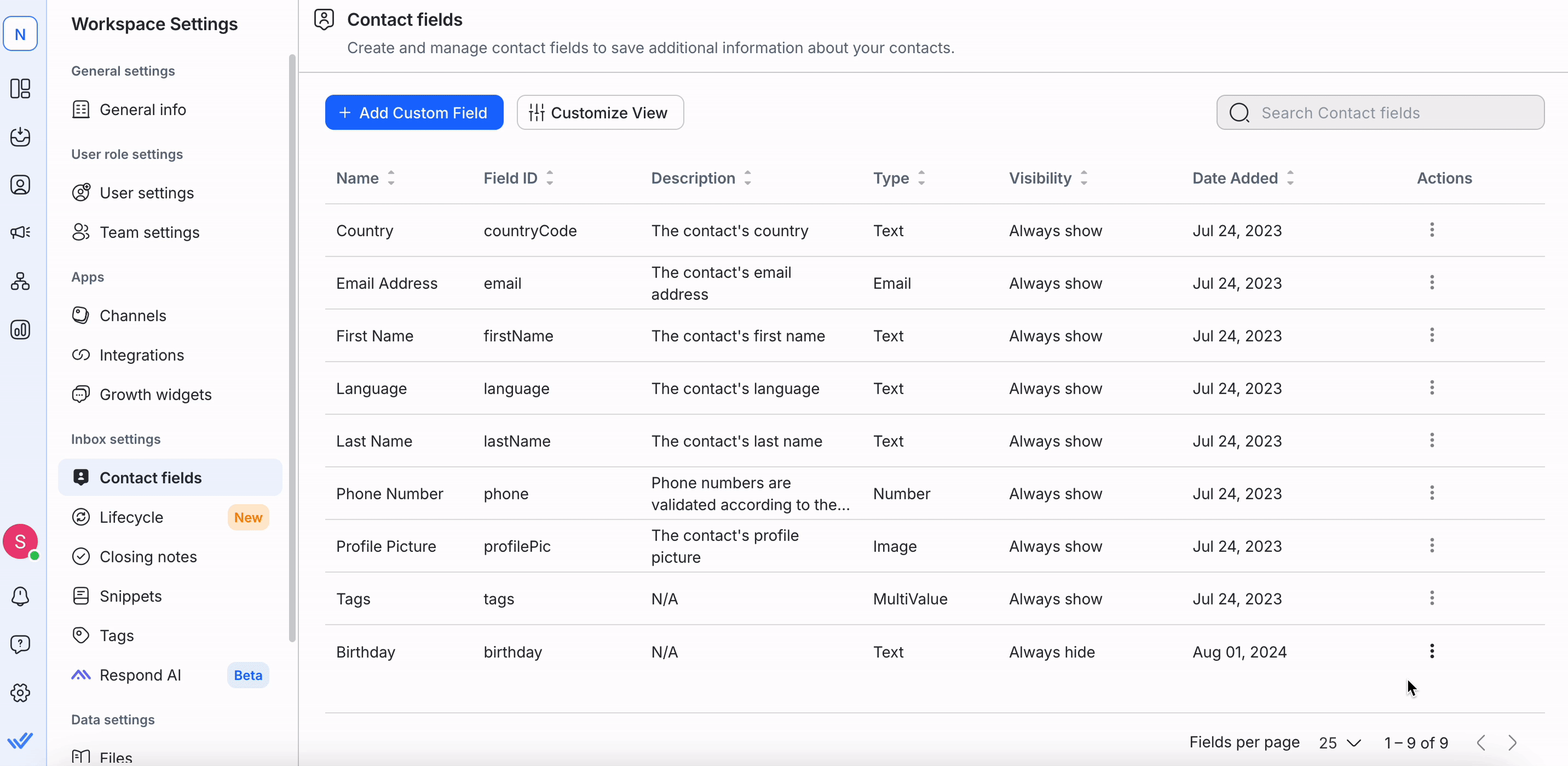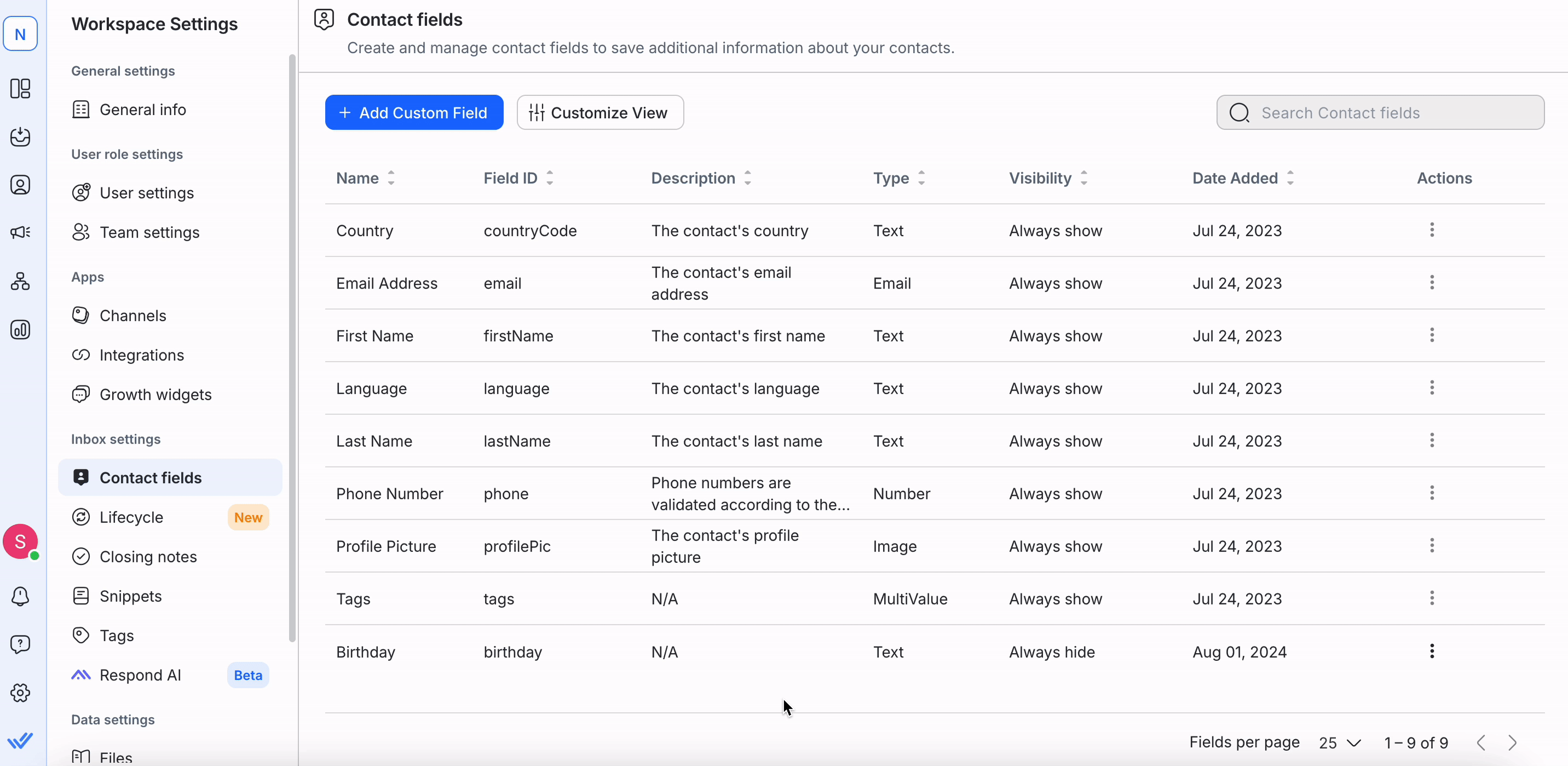 This setting can be accessed from the Settings navigation menu under the Workspace Settings sub-menu item, Contact Fields.