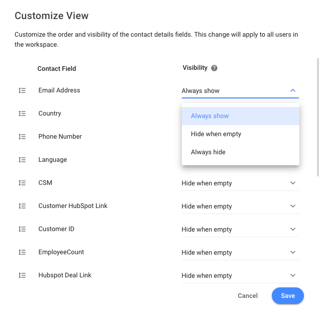 To change the display of the Contact Fields on the Contact Details Drawer, change the visibility setting to your desired display option.