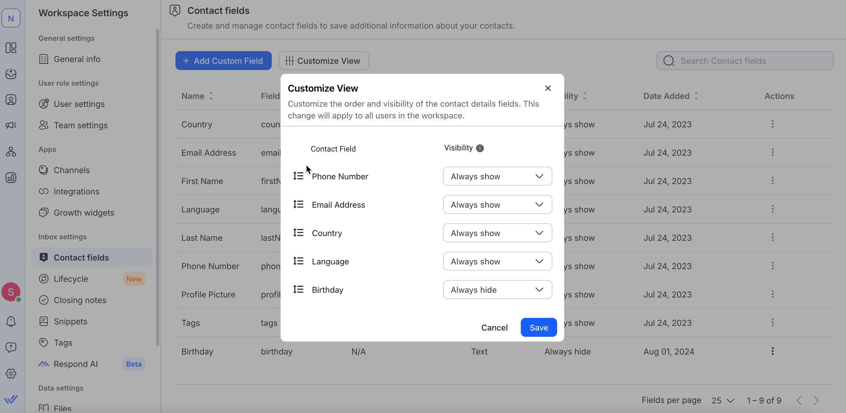 Once the changes are saved, the new visibility configuration will be reflected in the Contact Details Drawer for all Workspace Users.
